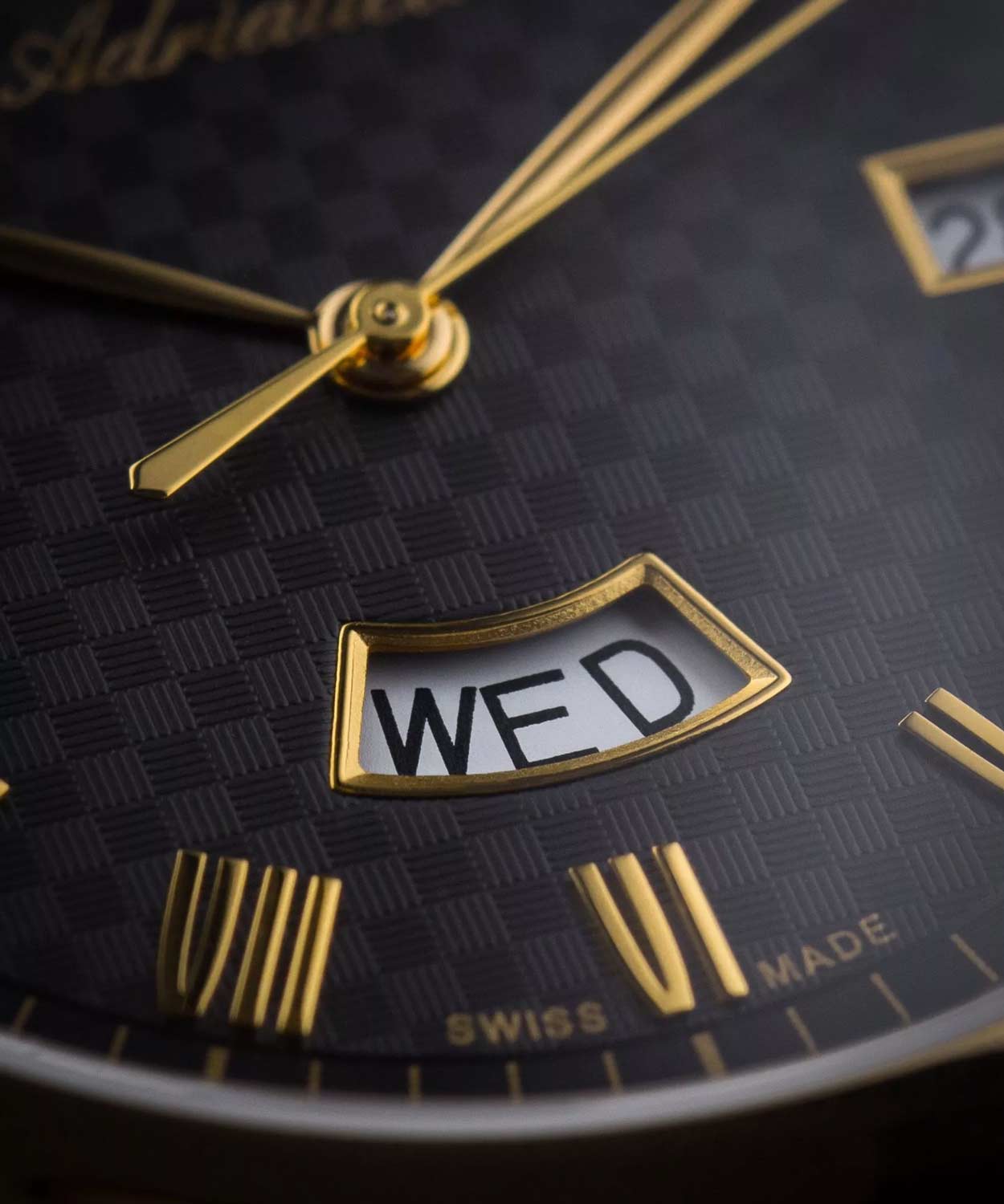 Часы Adriatica A1025.2166Q представляют собой идеальное сочетание элегантности и функциональности, разработанное для современных мужчин. Их стильный циферблат защищен сапфировым стекломСапфировое стеклоПрочный и надёжный материал из кристалла сапфира синтетического происхождения, характеризующийся особой твёрдостью и устойчивостью к царапинам и повреждениям., что придает дополнительную устойчивость к царапинам. Корпус из нержавеющей стали подчеркивает их изысканность и долговечность. Надежный кварцевый механизм с калибром RONDA 517 гарантирует точность времени, а водозащита WR 50 (5 ATM) обеспечивает защиту от воды в различных условиях. Браслет из нержавеющей стали с раскладной застёжкойРаскладная застёжкаТакой тип застёжки используется только на браслетах из металла. Она никогда не раскрывается полностью, происходит разделение на 2 и более частей. Раскладывающая застёжка снизит вероятность потери часов к минимуму., гармонично дополняет общий дизайн и обеспечивает комфортное ношение на запястье. Окошко даты находится в положении 3 часа. День недели отображается в положении 6 часов. БезельБезельВнешний ободок, закрепляющий стекло. В спортивных часах так называется поворотное кольцо с делениями на циферблате, выполняет роль таймера – замеряет отрезки времени на шкале. Неподвижный безель – элемент декора. Однонаправленно вращающийся безель на дайверских часах позволяет фиксировать моменты погружения и выныривания на поверхность. с PVD-покрытиемPVDУльтратонкое покрытие наносится в технике вакуумного напыления, сочетает в себе нитрид титана особой прочности со слоем золота или оксида хрома. Несёт в себе декоративную или защитную функцию..