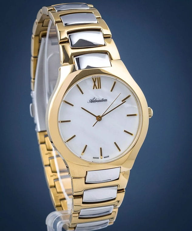 Часы Adriatica A3425.216FQ воплощают в себе утонченность и надежность швейцарского часового искусства. Эти часы идеально подойдут для тех, кто ценит стиль и качество в одном изделии. Перламутровый циферблат защищен минеральным стекломМинеральное стеклоМинеральное стекло представляет собой искусственно выращенный минерал кварца. Такое стекло отличается особой устойчивостью к повреждениям и царапинам. Уступает по некоторым качествам сапфировому стеклу. и заключен в корпус из нержавеющей стали с PVDPVDУльтратонкое покрытие наносится в технике вакуумного напыления, сочетает в себе нитрид титана особой прочности со слоем золота или оксида хрома. Несёт в себе декоративную или защитную функцию. покрытием цвета желтого золота, которое придает дополнительную прочность и элегантный вид. Часы оснащены кварцевым механизмом Ronda 763, обеспечивающим высокую точность и надежность. Водозащита 50WR делает их устойчивыми к воздействию воды, что позволяет не беспокоиться о случайных брызгах. Стальной браслет с частичным PVDPVDУльтратонкое покрытие наносится в технике вакуумного напыления, сочетает в себе нитрид титана особой прочности со слоем золота или оксида хрома. Несёт в себе декоративную или защитную функцию. покрытием цвета желтого золота с раскладной застёжкойРаскладная застёжкаТакой тип застёжки используется только на браслетах из металла. Она никогда не раскрывается полностью, происходит разделение на 2 и более частей. Раскладывающая застёжка снизит вероятность потери часов к минимуму. подчеркивает современный стиль и обеспечивает комфортное ношение.