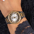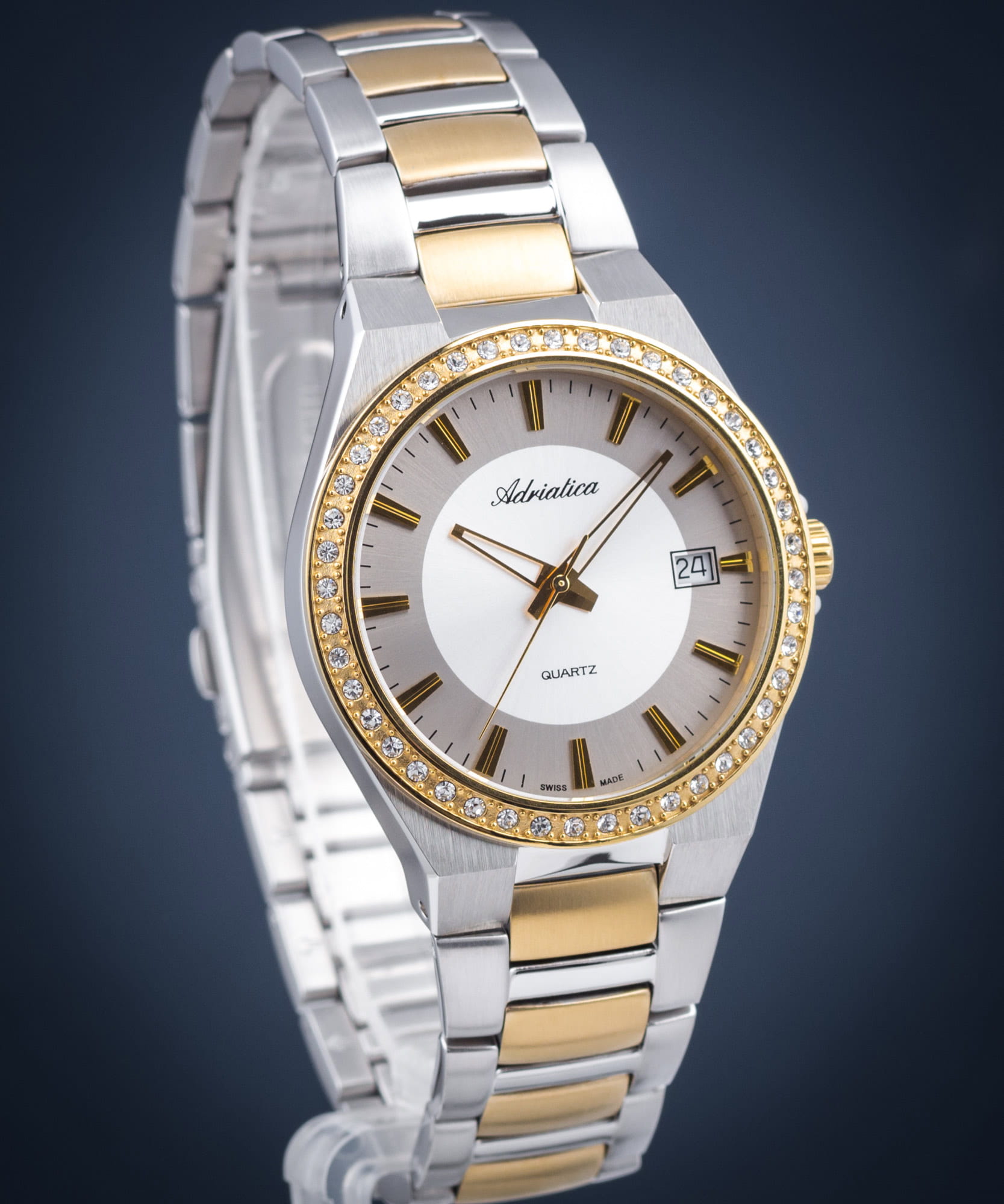 Женские швейцарские часы с минеральным стекломМинеральное стеклоМинеральное стекло представляет собой искусственно выращенный минерал кварца. Такое стекло отличается особой устойчивостью к повреждениям и царапинам. Уступает по некоторым качествам сапфировому стеклу. Adriatica A3804.2113QZ, кварцевый механизм Ronda 515, работающим от батарейки с высокой точностью.Класс водозащиты: 50 метров, позволит защитить корпус от случайных брызг или капель дождя. Корпус и браслет часов изготовлен из стали с PVD-покрытиемIP-покрытиеМетод ионного напыления. Демонстрирует повышенную устойчивость к истиранию, окислению и химическим веществам. Под воздействием высокого давления и температуры около 1500°C молекулы металла надёжно соединяются с частицами корпуса часов..Окошко даты находится в положении 3 часа.Стальной браслет на раскладной застёжкеРаскладная застёжкаТакой тип застёжки используется только на браслетах из металла. Она никогда не раскрывается полностью, происходит разделение на 2 и более частей. Раскладывающая застёжка снизит вероятность потери часов к минимуму.. Стрелки с люминесцентным покрытиемЛюминесцентное покрытиеПозволяет считывать показания времени в темноте. Производители наносят на стрелки, часовые индексы, безель или поверхность циферблата светонакопительный состав, дающий холодное свечение..БезельБезельВнешний ободок, закрепляющий стекло. В спортивных часах так называется поворотное кольцо с делениями на циферблате, выполняет роль таймера – замеряет отрезки времени на шкале. Неподвижный безель – элемент декора. Однонаправленно вращающийся безель на дайверских часах позволяет фиксировать моменты погружения и выныривания на поверхность. с PVD-покрытиемPVDУльтратонкое покрытие наносится в технике вакуумного напыления, сочетает в себе нитрид титана особой прочности со слоем золота или оксида хрома. Несёт в себе декоративную или защитную функцию. инкрустирован цирконами.