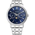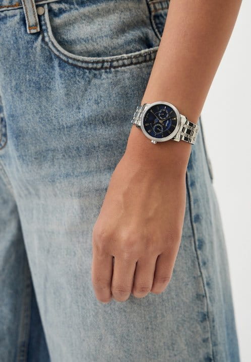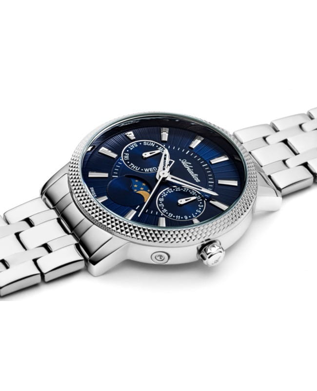 Женские часы Adriatica Moonphase A3808.5115QF имеют кварцевый механизм с высокой точностью. Минеральное стеклоМинеральное стеклоМинеральное стекло представляет собой искусственно выращенный минерал кварца. Такое стекло отличается особой устойчивостью к повреждениям и царапинам. Уступает по некоторым качествам сапфировому стеклу. обеспечивает надежную защиту синего циферблат. Корпус часов изготовлен из нержавеющей стали, что придает часам надежности.  Браслет из нержавеющей стали с раскладной застёжкойРаскладная застёжкаТакой тип застёжки используется только на браслетах из металла. Она никогда не раскрывается полностью, происходит разделение на 2 и более частей. Раскладывающая застёжка снизит вероятность потери часов к минимуму., гармонично дополняет общий дизайн и обеспечивает комфортное ношение на запястье. Надежный кварцевый механизм с калибром RONDA 706 гарантирует точность времени, а водозащита 50 метров, что позволит защитить корпус от случайных брызг или капель дождя. Часы оснащены тремя дополнительными циферблатами с функциями отображения числа месяца, дня недели и фазы Луны, что придает им неповторимый характер.