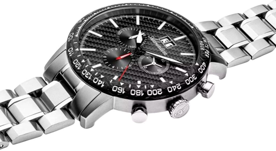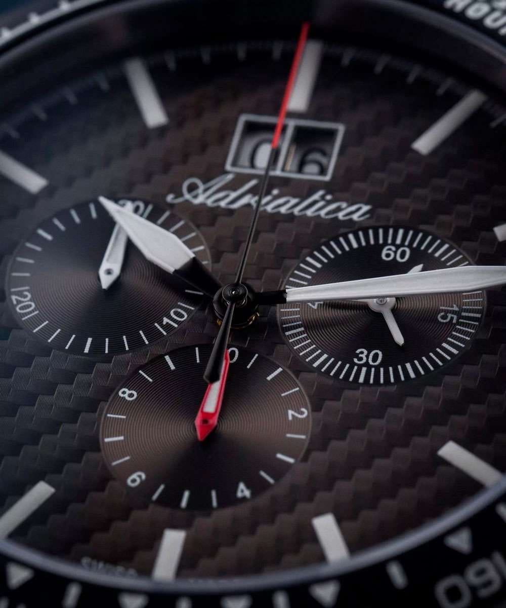 Мужские швейцарские часы-хронографХронографФункция позволяет измерять отрезки времени с особой точностью: часы, минуты, секунды. Верным признаком хронографа является наличие на циферблате 3 дополнительных окошек-счётчиков. с секундомеромСекундомерСекундоме́р — прибор, способный измерять интервалы времени с точностью до долей секунды. и тахиметромТахиметрРазмеченная шкала, располагается на ободке или безеле часов. Тахиметр позволяет рассчитать скорость на определённом участке пути, расстояние измеряется в километрах или милях. Adriatica Aviation A8383.4116CH воплощают в себе элегантность и функциональность, их выбирают целеустремленные мужчины, которые знают цену времени. Темно-серый циферблат часов, защищенный сапфировым стекломСапфировое стеклоПрочный и надёжный материал из кристалла сапфира синтетического происхождения, характеризующийся особой твёрдостью и устойчивостью к царапинам и повреждениям., заключен в корпус из титана диаметром 46 мм и толщиной 12 мм. Надежный кварцевый механизм с калибром Ronda 5040.B обеспечивает высокую точность, а водозащита 5 ATM делает часы устойчивыми к воздействию воды. Стальной браслет с раскладной застёжкойРаскладная застёжкаТакой тип застёжки используется только на браслетах из металла. Она никогда не раскрывается полностью, происходит разделение на 2 и более частей. Раскладывающая застёжка снизит вероятность потери часов к минимуму. обеспечивает комфортное и надежное ношение. Циферблат с метками в виде штрихов имеет 3 дополнительных циферблата, а также окошко даты в положении «12» , что добавляет практичности в повседневной жизни. Люминесцентное покрытиеЛюминесцентное покрытиеПозволяет считывать показания времени в темноте. Производители наносят на стрелки, часовые индексы, безель или поверхность циферблата светонакопительный состав, дающий холодное свечение. на стрелках и метках обеспечивает отличную видимость в темноте.