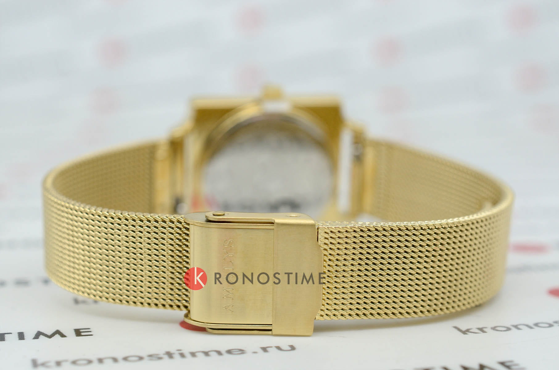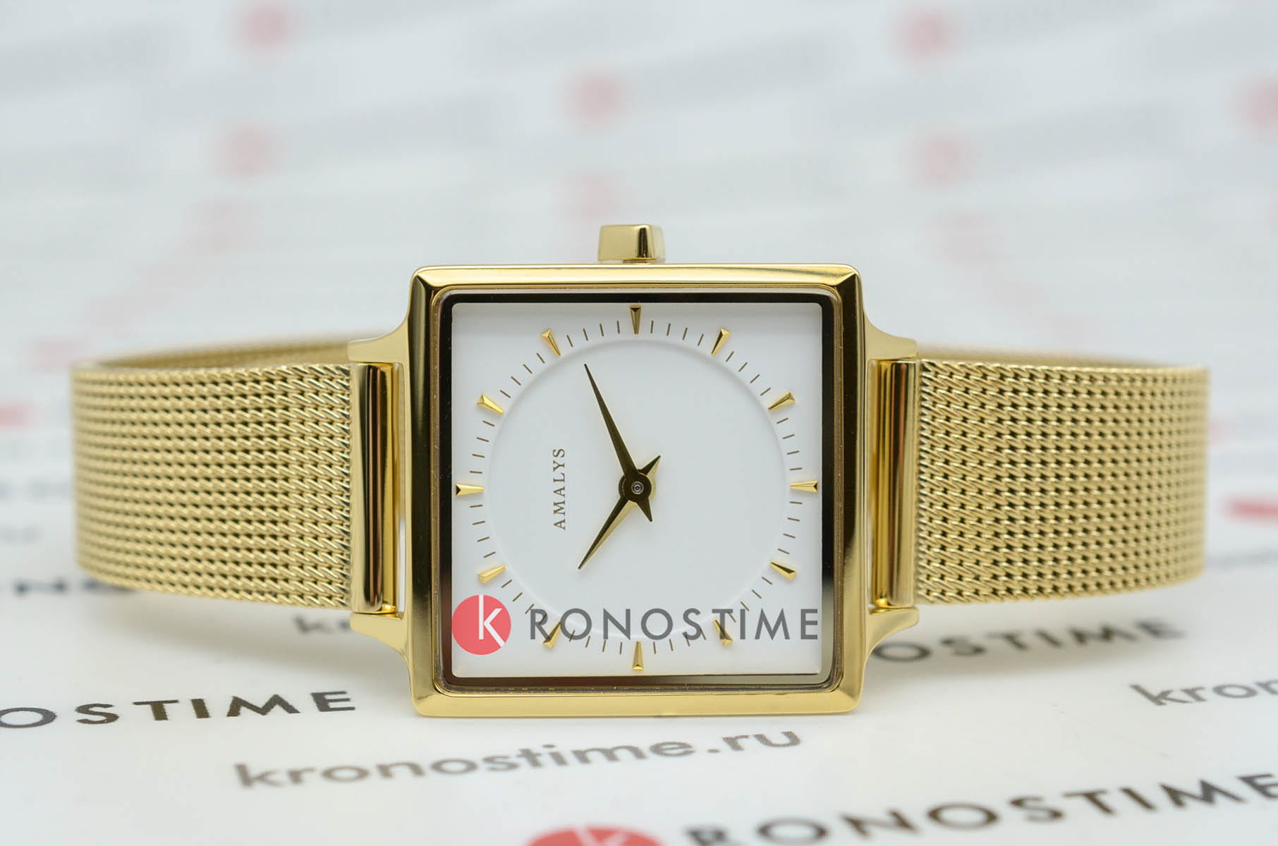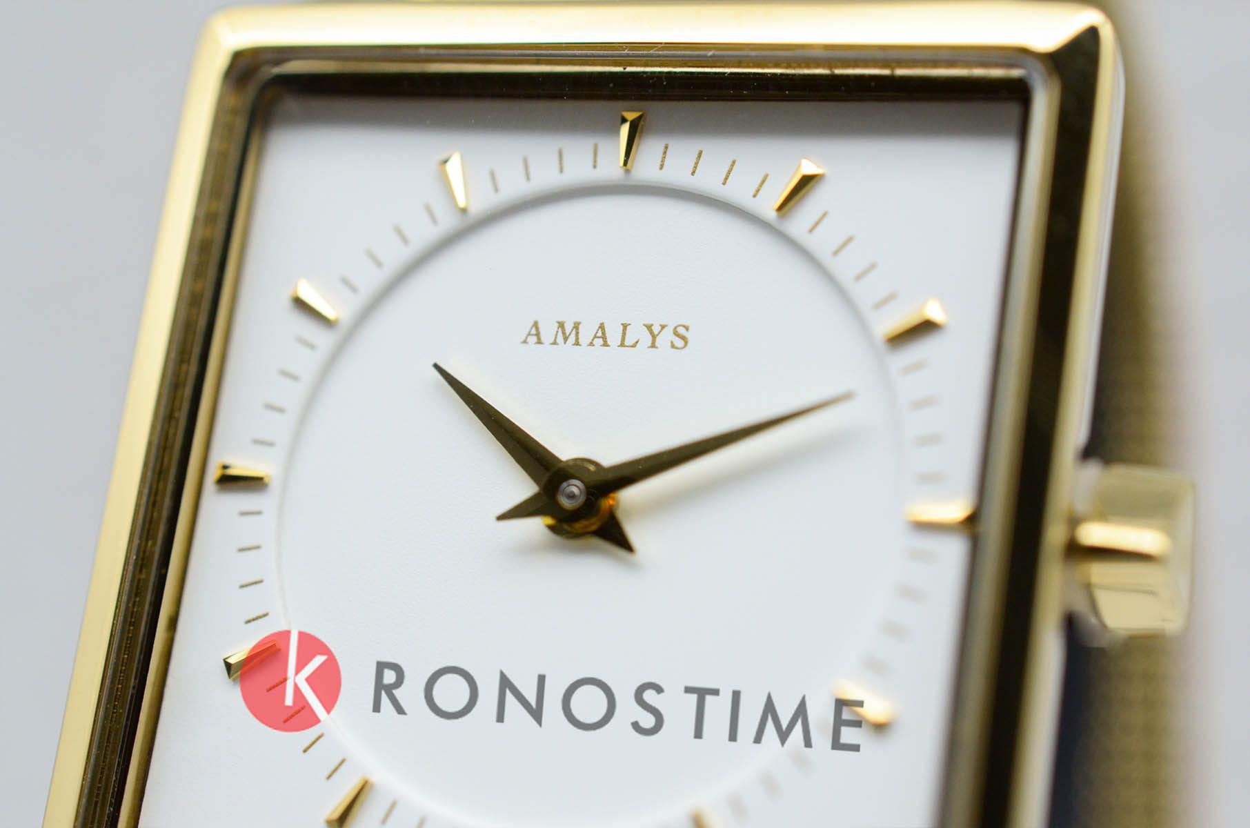 Amalys AMW-015 — женская модель с утончённой минималистичной эстетикой, где квадратный корпус с PVD-покрытиемPVDУльтратонкое покрытие наносится в технике вакуумного напыления, сочетает в себе нитрид титана особой прочности со слоем золота или оксида хрома. Несёт в себе декоративную или защитную функцию. размером 25 мм подчёркивает современный характер и чистоту линий. Механизм — точный кварцевый, обеспечивающий стабильный ход и надёжность в повседневном использовании. Поверхность циферблата оформлена в лаконичном стиле с тонкими метками и стрелками, создающими гармонию и визуальную лёгкость. Защитную функцию выполняет минеральное стеклоМинеральное стеклоМинеральное стекло представляет собой искусственно выращенный минерал кварца. Такое стекло отличается особой устойчивостью к повреждениям и царапинам. Уступает по некоторым качествам сапфировому стеклу., устойчивое к механическим воздействиям и сохраняющее читаемость при ежедневной носке. Браслет с PVD-покрытиемPVDУльтратонкое покрытие наносится в технике вакуумного напыления, сочетает в себе нитрид титана особой прочности со слоем золота или оксида хрома. Несёт в себе декоративную или защитную функцию. выполнен в виде «миланской сетки» шириной 14 мм, оснащён раскладным замкомРаскладной замокДанный вариант застежки используется только на часах с металлическим браслетом. Отличительная особенность такого крепления в том, что длина браслета становится универсальной и вы можете самостоятельно отрегулировать нужный вам размер – застежка просто двигается по браслету часов., его гибкая структура обеспечивает комфортное прилегание к запястью и визуальную утончённость. Единство корпуса и браслета создаёт целостный образ, а изысканная простота дизайна делает модель универсальной — она одинаково уместна и в деловой обстановке, и в повседневных сочетаниях.
