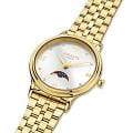 Amalys AMW-204 — женская модель с элегантным классическим стилем и утончёнными деталями. Круглый корпус изготовлен из нержавеющей стали с PVDPVDУльтратонкое покрытие наносится в технике вакуумного напыления, сочетает в себе нитрид титана особой прочности со слоем золота или оксида хрома. Несёт в себе декоративную или защитную функцию.-покрытием золотистого оттенка и гармонирует с браслетом в том же исполнении, состоящим из звеньев и обеспечивающим комфортное прилегание к запястью. Защитную функцию выполняет сапфировое стеклоСапфировое стеклоПрочный и надёжный материал из кристалла сапфира синтетического происхождения, характеризующийся особой твёрдостью и устойчивостью к царапинам и повреждениям., которое отличается стойкостью к царапинам и сохраняет высокую прозрачность. В основе лежит кварцевый механизм, гарантирующий точность хода и простоту эксплуатации. Циферблат украшен изящными римскими цифрами и метками, дополнен утончённым индикатором фаз Луны, который придаёт часам особый шарм и делает их акцентной деталью образа. Водозащита 3 ATM защищает от случайных брызг и дождя. Модель сочетает функциональность и изысканность, подойдёт как для повседневного стиля, так и для особых случаев.