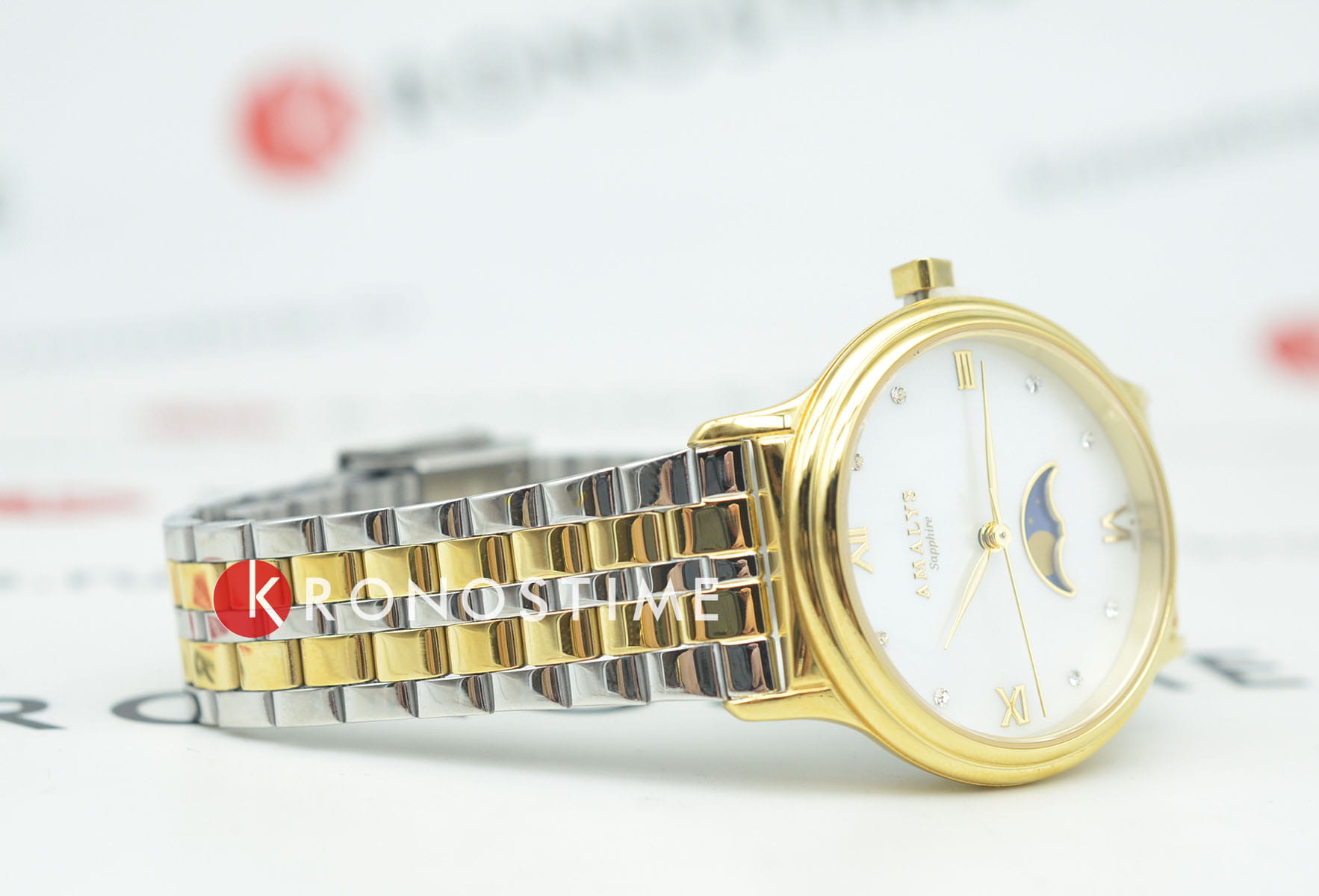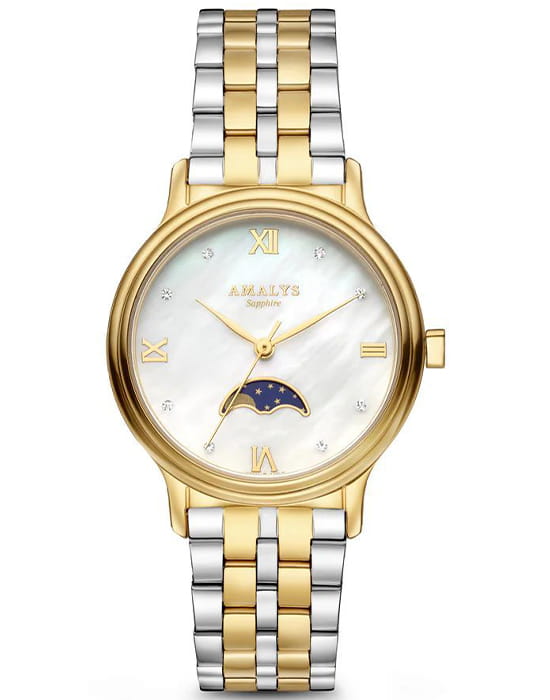 Amalys AMW-205 — женская модель с элегантным классическим стилем и утончёнными деталями. Круглый корпус изготовлен из нержавеющей стали с PVDPVDУльтратонкое покрытие наносится в технике вакуумного напыления, сочетает в себе нитрид титана особой прочности со слоем золота или оксида хрома. Несёт в себе декоративную или защитную функцию.-покрытием золотистого оттенка и гармонирует с браслетом в том же исполнении, состоящим из звеньев и обеспечивающим комфортное прилегание к запястью. Защитную функцию выполняет сапфировое стеклоСапфировое стеклоПрочный и надёжный материал из кристалла сапфира синтетического происхождения, характеризующийся особой твёрдостью и устойчивостью к царапинам и повреждениям., которое отличается стойкостью к царапинам и сохраняет высокую прозрачность. В основе лежит кварцевый механизм, гарантирующий точность хода и простоту эксплуатации. Циферблат украшен изящными римскими цифрами и метками, дополнен утончённым индикатором фаз Луны, который придаёт часам особый шарм и делает их акцентной деталью образа. Водозащита 3 ATM защищает от случайных брызг и дождя. Модель сочетает функциональность и изысканность, подойдёт как для повседневного стиля, так и для особых случаев.