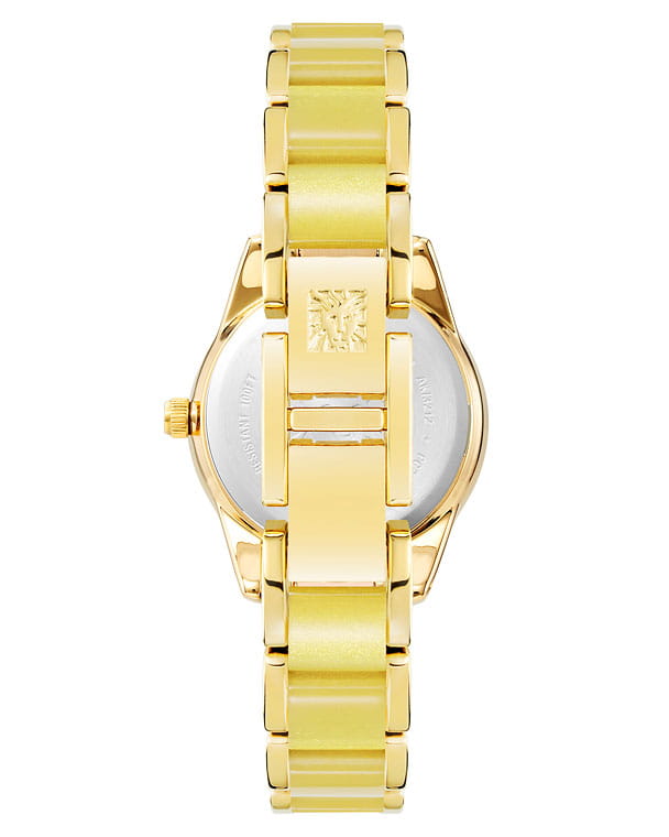 Женские кварцевые часы Anne Klein 3212YLGB представляют собой элегантный аксессуар с корпусом из нержавеющей стали с PVDPVDУльтратонкое покрытие наносится в технике вакуумного напыления, сочетает в себе нитрид титана особой прочности со слоем золота или оксида хрома. Несёт в себе декоративную или защитную функцию.-покрытием в золотистом оттенке диаметром 30 мм. Модель оснащена круглым желтым циферблатом нежно-желтого цвета с позолоченными стрелками с люминесцентным покрытиемЛюминесцентное покрытиеПозволяет считывать показания времени в темноте. Производители наносят на стрелки, часовые индексы, безель или поверхность циферблата светонакопительный состав, дающий холодное свечение. для отличной читаемости в любое время суток и часовыми метками, кварцевым механизмом японского производства с точностью хода ±20 секунд в месяц. Защитное минеральное стеклоМинеральное стеклоМинеральное стекло представляет собой искусственно выращенный минерал кварца. Такое стекло отличается особой устойчивостью к повреждениям и царапинам. Уступает по некоторым качествам сапфировому стеклу. устойчиво к царапинам, а водонепроницаемость 30 метров (3 атм) обеспечивает защиту от брызг и дождя. Браслет из нержавеющей стали с PVDPVDУльтратонкое покрытие наносится в технике вакуумного напыления, сочетает в себе нитрид титана особой прочности со слоем золота или оксида хрома. Несёт в себе декоративную или защитную функцию.-покрытием дополнен элегантными желтыми пластиковыми вставками.