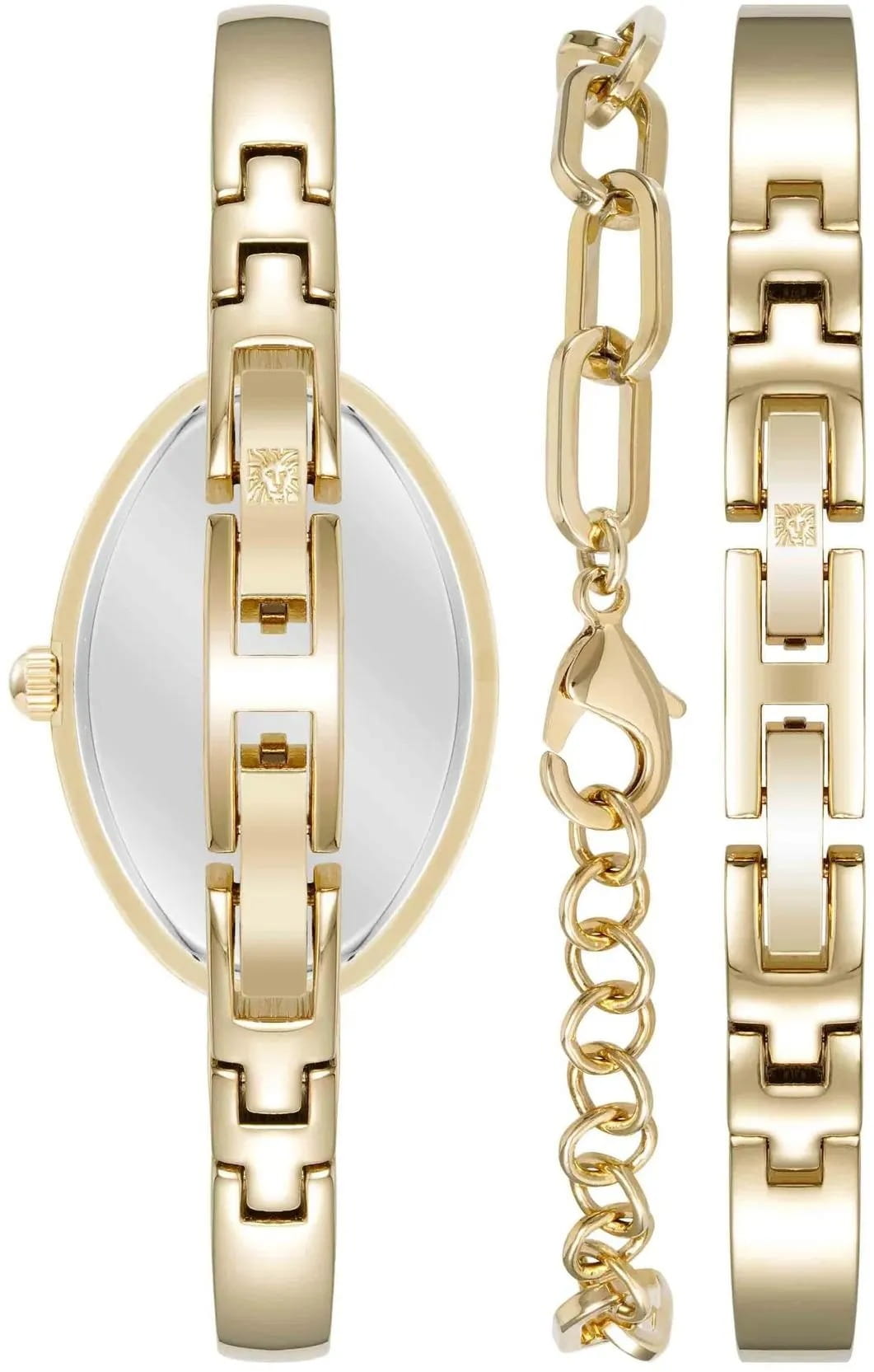 Женские кварцевые часы Anne Klein Box Set 5074GPST представляют собой элегантный аксессуар с овальным корпусом 20×30 мм из латуни с PVDPVDУльтратонкое покрытие наносится в технике вакуумного напыления, сочетает в себе нитрид титана особой прочности со слоем золота или оксида хрома. Несёт в себе декоративную или защитную функцию.-покрытием в золотистом оттенке и обрамленный бриллиантами. Модель оснащена кварцевым механизмом японского производства с точностью хода ±20 секунд в месяц и аналоговой индикацией времени. Циферблат бежевого цвета с позолоченными стрелками защищен минеральным стекломМинеральное стеклоМинеральное стекло представляет собой искусственно выращенный минерал кварца. Такое стекло отличается особой устойчивостью к повреждениям и царапинам. Уступает по некоторым качествам сапфировому стеклу., устойчивым к царапинам. Водонепроницаемость 30 метров (3 атм) обеспечивает защиту от брызг и дождя. Металлический браслет из нержавеющей стали шириной 20 мм и так же обрамленный бриллиантами, гармонично сочетается с корпусом, создавая целостный образ. Часы толщиной 6 мм отличаются утонченным профилем и комфортной посадкой на запястье. Прилагается два дополнительных браслета.