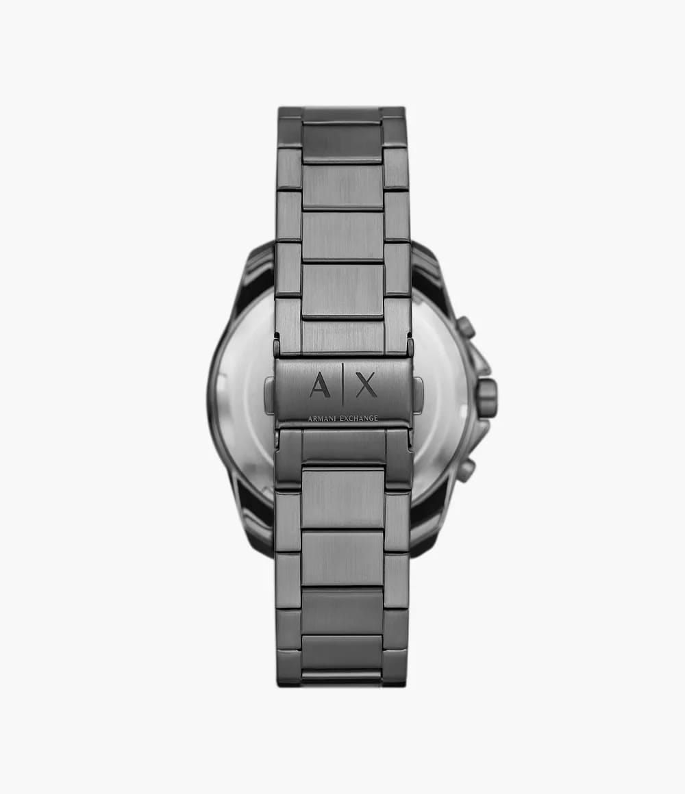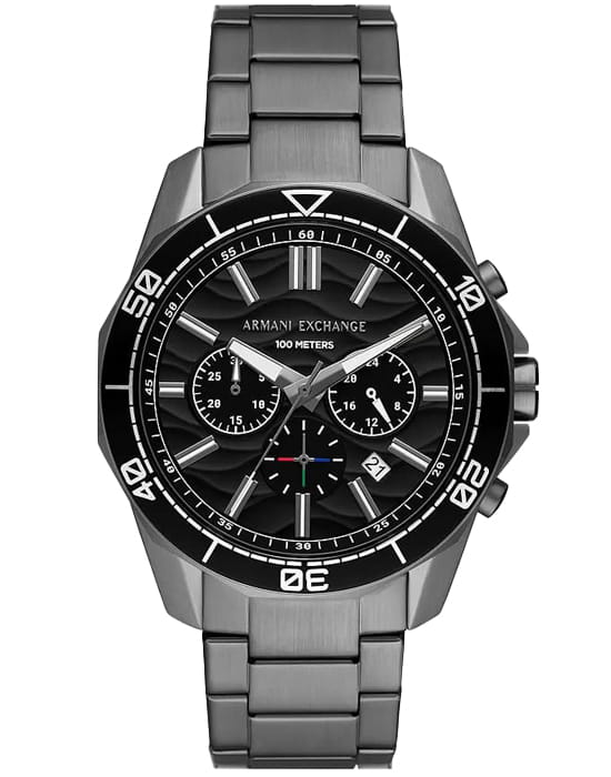 Мужские наручные часы-хронографХронографФункция позволяет измерять отрезки времени с особой точностью: часы, минуты, секунды. Верным признаком хронографа является наличие на циферблате 3 дополнительных окошек-счётчиков. с минеральным стекломМинеральное стеклоМинеральное стекло представляет собой искусственно выращенный минерал кварца. Такое стекло отличается особой устойчивостью к повреждениям и царапинам. Уступает по некоторым качествам сапфировому стеклу. Armani Exchange Dante AX1959, кварцевый механизм с высокой точностью. Класс водозащиты: 100 метров, позволит плавать, нырять и заниматься другими водными видами спорта. Корпус часов изготовлен из нержавеющей стали с IP-покрытиемIP-покрытиеМетод ионного напыления. Демонстрирует повышенную устойчивость к истиранию, окислению и химическим веществам. Под воздействием высокого давления и температуры около 1500°C молекулы металла надёжно соединяются с частицами корпуса часов.. Стальной браслет с IP-покрытиемIP-покрытиеМетод ионного напыления. Демонстрирует повышенную устойчивость к истиранию, окислению и химическим веществам. Под воздействием высокого давления и температуры около 1500°C молекулы металла надёжно соединяются с частицами корпуса часов. на раскладной застёжкеРаскладная застёжкаТакой тип застёжки используется только на браслетах из металла. Она никогда не раскрывается полностью, происходит разделение на 2 и более частей. Раскладывающая застёжка снизит вероятность потери часов к минимуму.. Вращающийся безельБезельВнешний ободок, закрепляющий стекло. В спортивных часах так называется поворотное кольцо с делениями на циферблате, выполняет роль таймера – замеряет отрезки времени на шкале. Неподвижный безель – элемент декора. Однонаправленно вращающийся безель на дайверских часах позволяет фиксировать моменты погружения и выныривания на поверхность. с IP-покрытиемIP-покрытиеМетод ионного напыления. Демонстрирует повышенную устойчивость к истиранию, окислению и химическим веществам. Под воздействием высокого давления и температуры около 1500°C молекулы металла надёжно соединяются с частицами корпуса часов.. Текстурированный циферблат с метками в виде штрихов.