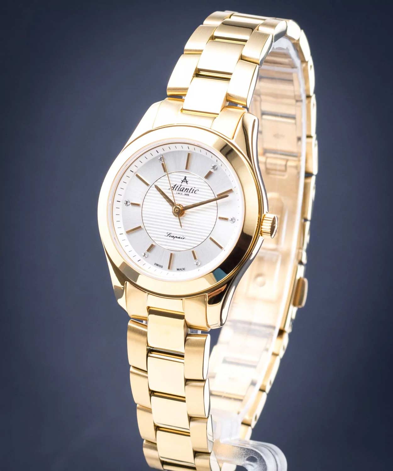 Женские швейцарские часы Atlantic Seapair Ladies 20335.45.21, кварцевый механизм с высокой точностью. Циферблат часов с люминесцентным покрытиемЛюминесцентное покрытиеПозволяет считывать показания времени в темноте. Производители наносят на стрелки, часовые индексы, безель или поверхность циферблата светонакопительный состав, дающий холодное свечение. стрелок и меток, дополнен сапфировым стекломСапфировое стеклоПрочный и надёжный материал из кристалла сапфира синтетического происхождения, характеризующийся особой твёрдостью и устойчивостью к царапинам и повреждениям., устойчивым к появлению царапин и обладающее высокой прозрачностью. Класс водозащиты: 30 метров, позволит защитить корпус от случайных брызг или капель дождя. Корпус часов изготовлен из нержавеющей стали с PVD-покрытиемPVDУльтратонкое покрытие наносится в технике вакуумного напыления, сочетает в себе нитрид титана особой прочности со слоем золота или оксида хрома. Несёт в себе декоративную или защитную функцию.. Стальной браслет с раскладной застёжкойРаскладная застёжкаТакой тип застёжки используется только на браслетах из металла. Она никогда не раскрывается полностью, происходит разделение на 2 и более частей. Раскладывающая застёжка снизит вероятность потери часов к минимуму. и PVD-покрытиемPVDУльтратонкое покрытие наносится в технике вакуумного напыления, сочетает в себе нитрид титана особой прочности со слоем золота или оксида хрома. Несёт в себе декоративную или защитную функцию..