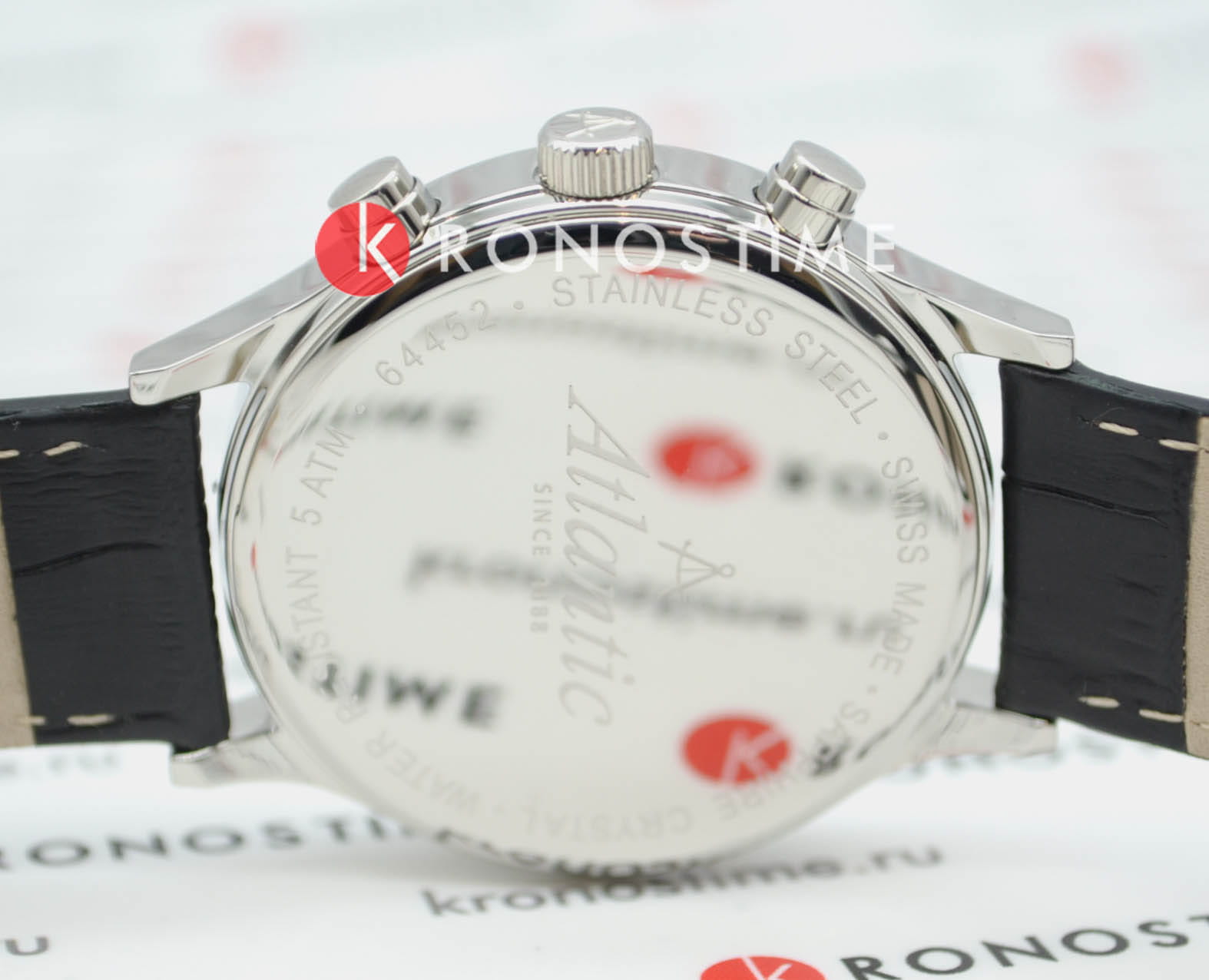 Мужские швейцарские часы-хронографХронографФункция позволяет измерять отрезки времени с особой точностью: часы, минуты, секунды. Верным признаком хронографа является наличие на циферблате 3 дополнительных окошек-счётчиков. с секундомеромСекундомерСекундоме́р — прибор, способный измерять интервалы времени с точностью до долей секунды. Atlantic Seabase 64452.41.18, кварцевый механизм с высокой точностью. Сапфировое стеклоСапфировое стеклоПрочный и надёжный материал из кристалла сапфира синтетического происхождения, характеризующийся особой твёрдостью и устойчивостью к царапинам и повреждениям. устойчивое к появлению царапин, обладающее высокой прозрачностью. Класс водозащиты: 50 метров, позволит защитить корпус от случайных брызг или капель дождя. Корпус часов изготовлен из стали. Кожаный ремешок на стандартной застёжке. Окошко даты находится в положении 3 часа.