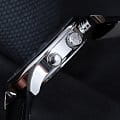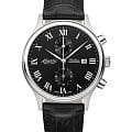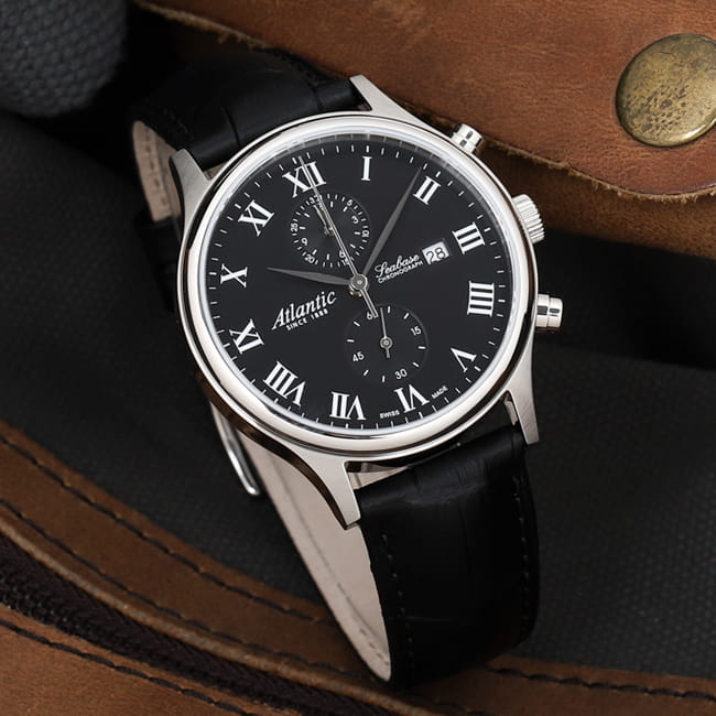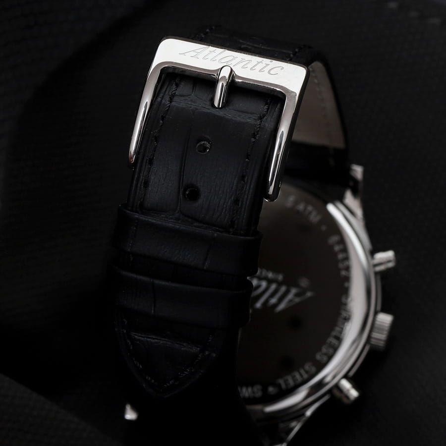 Мужские швейцарские часы-хронографХронографФункция позволяет измерять отрезки времени с особой точностью: часы, минуты, секунды. Верным признаком хронографа является наличие на циферблате 3 дополнительных окошек-счётчиков. с секундомеромСекундомерСекундоме́р — прибор, способный измерять интервалы времени с точностью до долей секунды. Atlantic Seabase 64452.41.68, кварцевый механизм с высокой точностью. Cапфировое стеклоСапфировое стеклоПрочный и надёжный материал из кристалла сапфира синтетического происхождения, характеризующийся особой твёрдостью и устойчивостью к царапинам и повреждениям. устойчивое к появлению царапин и обладающее высокой прозрачностью. Корпус часов изготовлен из нержавеющей стали. На циферблате расположены  римские цифры, два дополнительных индикатора, окошко даты в положении 3 часов. Класс водозащиты: 50 метров, позволит защитить корпус от случайных брызг или капель дождя. Кожаный ремешок на стандартной застежке.