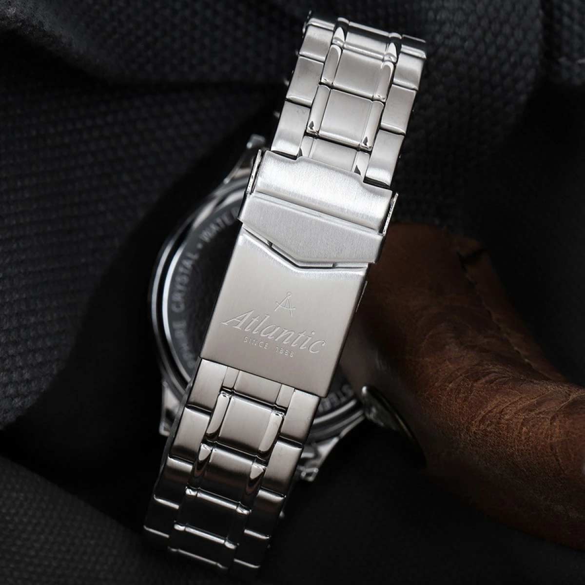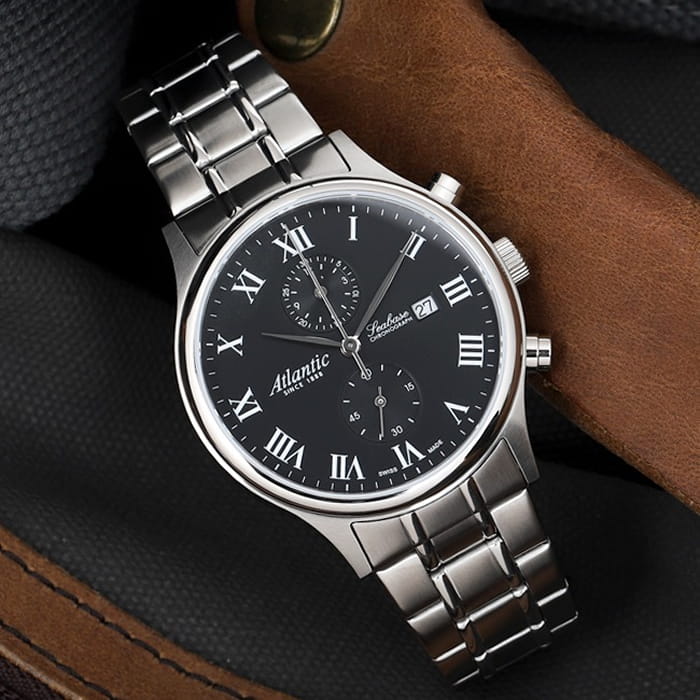 Мужские швейцарские часы-хронографХронографФункция позволяет измерять отрезки времени с особой точностью: часы, минуты, секунды. Верным признаком хронографа является наличие на циферблате 3 дополнительных окошек-счётчиков. с секундомеромСекундомерСекундоме́р — прибор, способный измерять интервалы времени с точностью до долей секунды. Atlantic Seabase 64457.41.68, кварцевый механизм с высокой точностью. Cапфировое стеклоСапфировое стеклоПрочный и надёжный материал из кристалла сапфира синтетического происхождения, характеризующийся особой твёрдостью и устойчивостью к царапинам и повреждениям. устойчивое к появлению царапин и обладающее высокой прозрачностью. Корпус и браслет часов изготовлены из нержавеющей стали. На циферблате расположены римские цифры, два дополнительных индикатора, окошко даты в положении 3 часов. Класс водозащиты: 50 метров, позволит защитить корпус от случайных брызг или капель дождя. Стальной браслет на раскладной застёжкеРаскладная застёжкаТакой тип застёжки используется только на браслетах из металла. Она никогда не раскрывается полностью, происходит разделение на 2 и более частей. Раскладывающая застёжка снизит вероятность потери часов к минимуму..