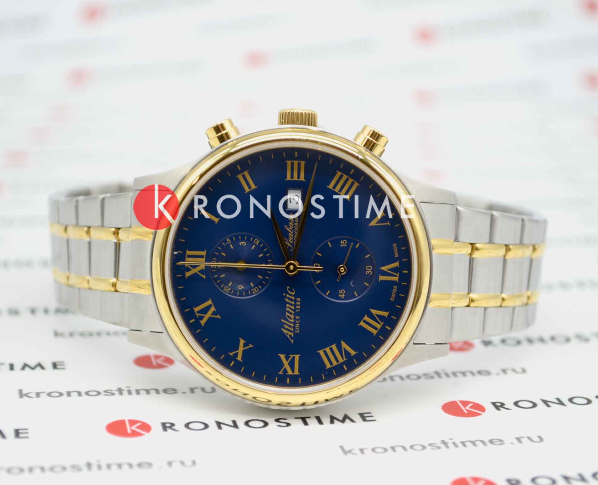 Мужские швейцарские часы-хронографХронографФункция позволяет измерять отрезки времени с особой точностью: часы, минуты, секунды. Верным признаком хронографа является наличие на циферблате 3 дополнительных окошек-счётчиков. с секундомеромСекундомерСекундоме́р — прибор, способный измерять интервалы времени с точностью до долей секунды. Atlantic Seabase 64457.43.58G, кварцевый механизм с высокой точностью. Cапфировое стеклоСапфировое стеклоПрочный и надёжный материал из кристалла сапфира синтетического происхождения, характеризующийся особой твёрдостью и устойчивостью к царапинам и повреждениям. устойчивое к появлению царапин и обладающее высокой прозрачностью. Корпус и браслет часов изготовлены из нержавеющей стали с частичным PVDPVDУльтратонкое покрытие наносится в технике вакуумного напыления, сочетает в себе нитрид титана особой прочности со слоем золота или оксида хрома. Несёт в себе декоративную или защитную функцию. покрытием. На циферблате расположены римские цифры, два дополнительных индикатора, окошко даты в положении 3 часов. Класс водозащиты: 50 метров, позволит защитить корпус от случайных брызг или капель дождя. Стальной браслет на раскладной застёжкеРаскладная застёжкаТакой тип застёжки используется только на браслетах из металла. Она никогда не раскрывается полностью, происходит разделение на 2 и более частей. Раскладывающая застёжка снизит вероятность потери часов к минимуму..