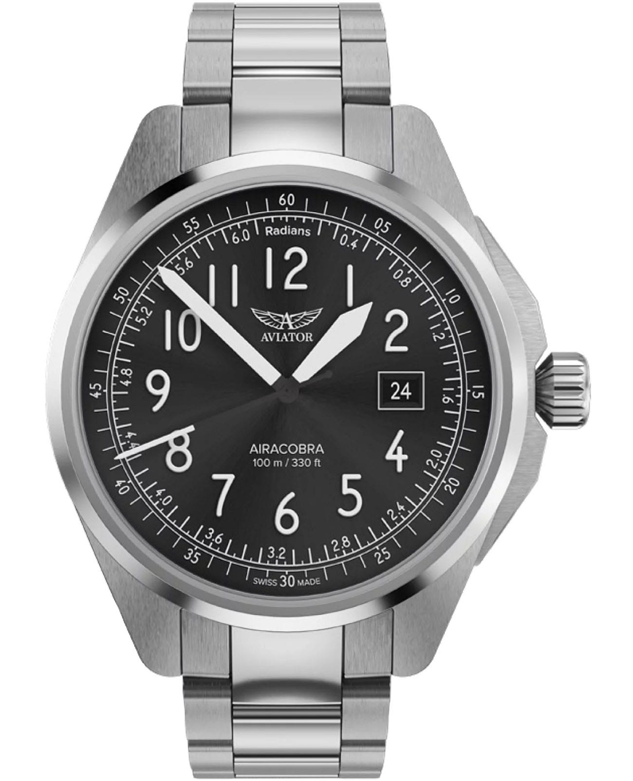 Aviator Airacobra 43 Type B V.1.38.0.322.5 — надёжные швейцарские пилотские часы с насыщенным функционалом и строгим авиационным дизайном. Корпус диаметром 42,8 мм выполнен из нержавеющей стали 316L. Элегантный циферблат имеет крупные арабские цифры. Стрелки и метки покрыты люминесцентным покрытиемЛюминесцентное покрытиеПозволяет считывать показания времени в темноте. Производители наносят на стрелки, часовые индексы, безель или поверхность циферблата светонакопительный состав, дающий холодное свечение. Superluminova — это обеспечивает отличную читаемость в любых условиях. Окошко даты расположено у отметки «3 часа». На борту установлен швейцарский кварцевый механизм, способный с высокой точностью отображать время, дату. В механизме 4 камня. Изысканный циферблат защищён стойким сапфировым стекломСапфировое стеклоПрочный и надёжный материал из кристалла сапфира синтетического происхождения, характеризующийся особой твёрдостью и устойчивостью к царапинам и повреждениям. с антибликовым покрытиемАнтибликовое покрытиеСлой оксида металла в 0,13-0,3 микрон, благодаря которому стекло часов не бликует и не отражает свет. Антибликовое покрытие уменьшает отражение света в 10 раз, обеспечивая отличную читаемость показателей циферблата., завинчивающаяся заводная головка и задняя крышка обеспечивают уровень водозащиты до 100 метров. Стальной браслет с раскладной застёжкойРаскладная застёжкаТакой тип застёжки используется только на браслетах из металла. Она никогда не раскрывается полностью, происходит разделение на 2 и более частей. Раскладывающая застёжка снизит вероятность потери часов к минимуму. обеспечивает удобство и надёжную фиксацию. Airacobra 43 Type B — инструментальные пилотские часы для тех, кто ценит надёжность, точность и удобную функциональность второго часового пояса в эстетике классических авиационных хронометров. Лимитированная серия.