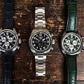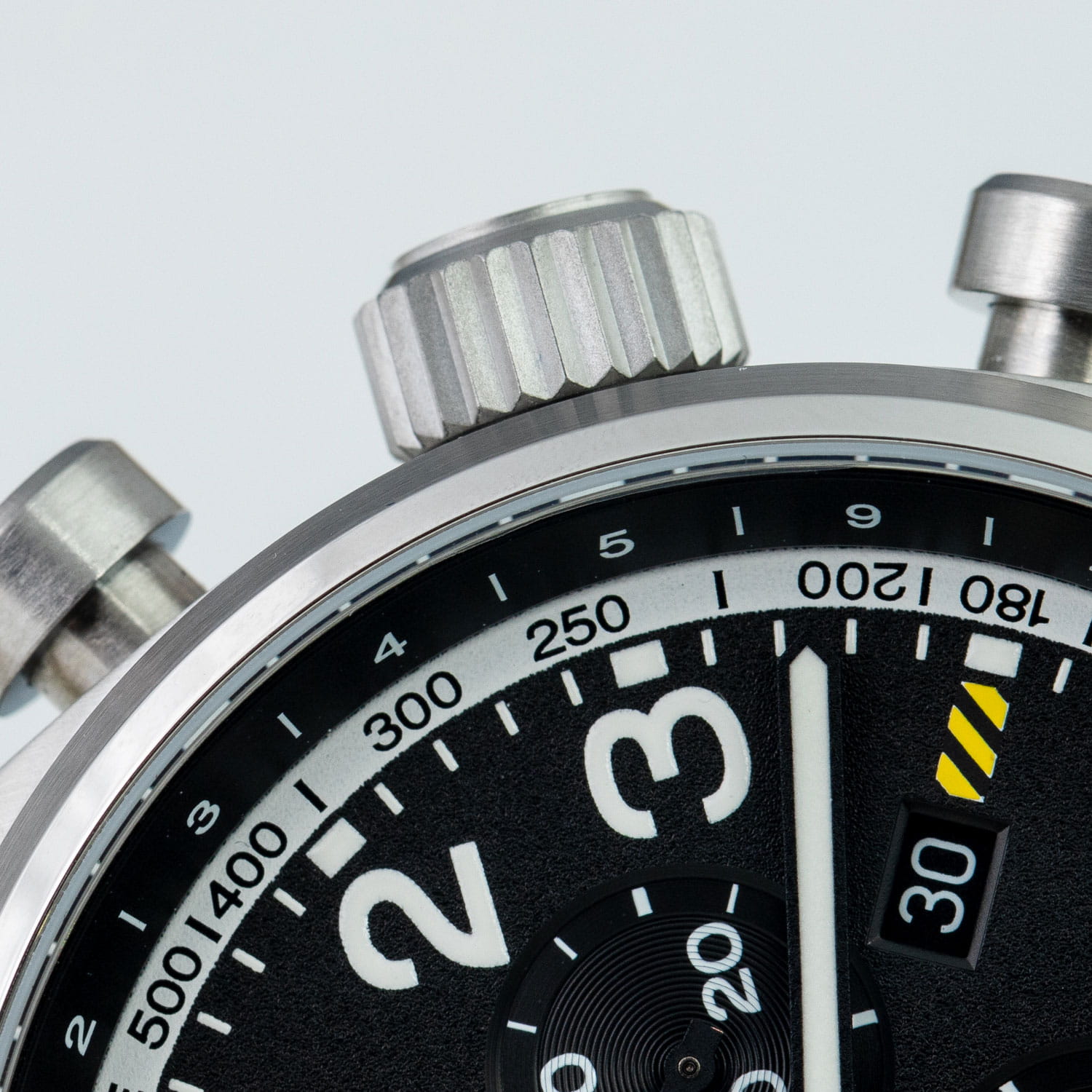 Циферблат оформлен в классическом aviator-стиле: крупные арабские цифры, широкие стрелки и чёткое деление минут позволяют считывать время мгновенно. Стрелки и метки покрыты люминесцентным покрытиемЛюминесцентное покрытиеПозволяет считывать показания времени в темноте. Производители наносят на стрелки, часовые индексы, безель или поверхность циферблата светонакопительный состав, дающий холодное свечение. для отличной читаемости при слабом освещении.