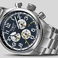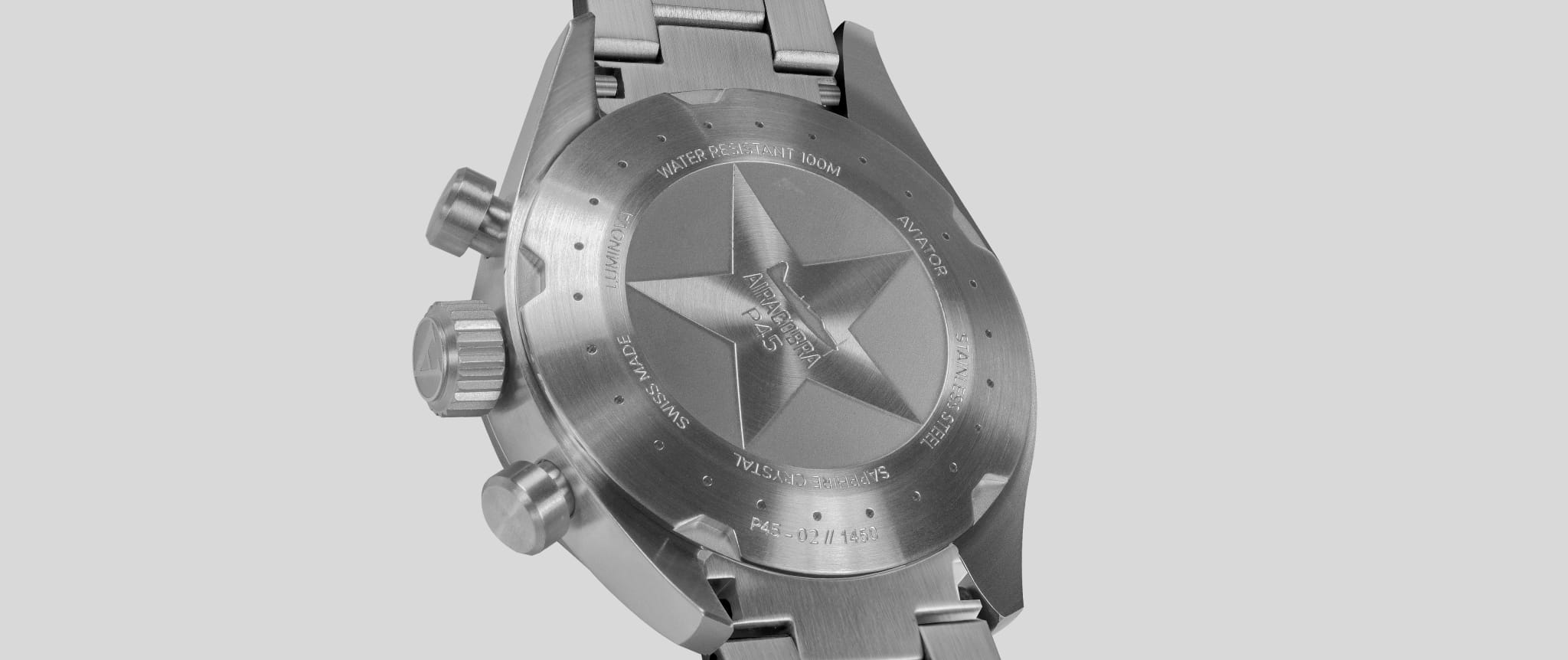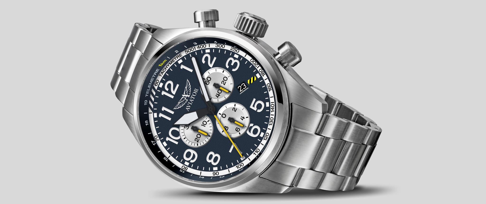 Aviator Airacobra P45 Chrono V.2.25.0.170.5 — швейцарские часы в духе пилотских инструментов, объединяющий точность, удобство и лаконичный дизайн. Диаметр корпуса — 45 мм, выполнен из нержавеющей стали 316L, что подчёркивает техническую надёжность в образе часов. Циферблат оформлен в классическом aviator-стиле: крупные арабские цифры, широкие стрелки и чёткое деление минут позволяют считывать время мгновенно. Стрелки и метки покрыты люминесцентным покрытиемЛюминесцентное покрытиеПозволяет считывать показания времени в темноте. Производители наносят на стрелки, часовые индексы, безель или поверхность циферблата светонакопительный состав, дающий холодное свечение. Superluminova для отличной читаемости при слабом освещении. Циферблат защищён стойким сапфировым стекломСапфировое стеклоПрочный и надёжный материал из кристалла сапфира синтетического происхождения, характеризующийся особой твёрдостью и устойчивостью к царапинам и повреждениям. с антибликовым покрытиемАнтибликовое покрытиеСлой оксида металла в 0,13-0,3 микрон, благодаря которому стекло часов не бликует и не отражает свет. Антибликовое покрытие уменьшает отражение света в 10 раз, обеспечивая отличную читаемость показателей циферблата.. У модели присутствуют дата и точный откидной механизм завинчивающейся заводной головки и задней крышки, обеспечивающий надёжную водозащиту до 100 м и защиту от ударов. Внутри установлен швейцарский кварцевый механизм, который обеспечивает функции хронографаХронографФункция позволяет измерять отрезки времени с особой точностью: часы, минуты, секунды. Верным признаком хронографа является наличие на циферблате 3 дополнительных окошек-счётчиков.. Функции добавить (ADD) и разделить (SPLIT). Часы комплектуются браслетом из нержавеющей стали с удобной раскладной застёжкойРаскладная застёжкаТакой тип застёжки используется только на браслетах из металла. Она никогда не раскрывается полностью, происходит разделение на 2 и более частей. Раскладывающая застёжка снизит вероятность потери часов к минимуму., обеспечивающей надёжную фиксацию и комфорт при ежедневной носке. Эти изысканные часы так же обладают функциями тахиметраТахиметрРазмеченная шкала, располагается на ободке или безеле часов. Тахиметр позволяет рассчитать скорость на определённом участке пути, расстояние измеряется в километрах или милях., секундомераСекундомерСекундоме́р — прибор, способный измерять интервалы времени с точностью до долей секунды. и телеметра. Airacobra — это практичный и стильный инструмент для путешествий и активной повседневности, объединяющий авиационную эстетику, точный механизм и удобство.