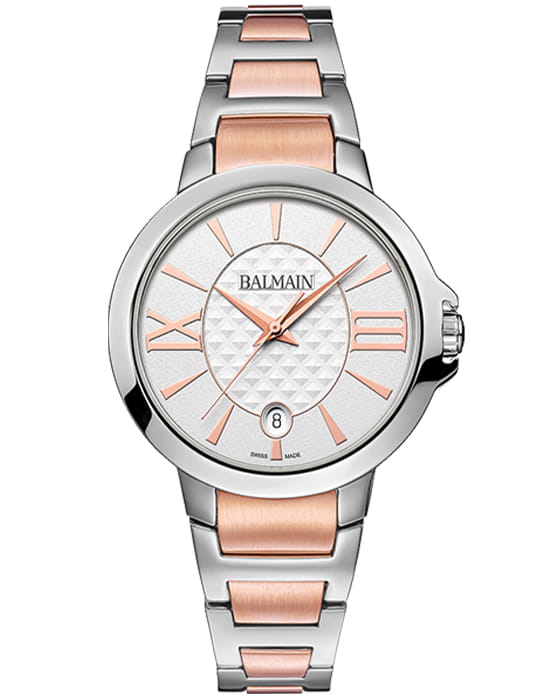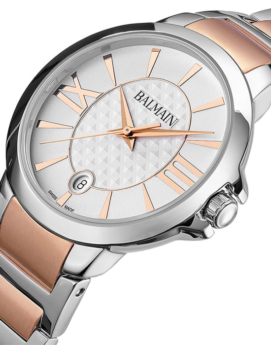 Женские часы Balmain Tilia B4571.38.22 кварцевый механизм с высокой точностью. Сапфировое стеклоСапфировое стеклоПрочный и надёжный материал из кристалла сапфира синтетического происхождения, характеризующийся особой твёрдостью и устойчивостью к царапинам и повреждениям. устойчивое к появлению царапин, обладающее высокой прозрачностью. Корпус изготовлен из нержавеющей стали. Класс водозащиты: 30 метров, позволит защитить корпус от случайных брызг или капель дождя. Стальной браслет с PVD-покрытиемPVDУльтратонкое покрытие наносится в технике вакуумного напыления, сочетает в себе нитрид титана особой прочности со слоем золота или оксида хрома. Несёт в себе декоративную или защитную функцию.. на застёжке «бабочка» с кнопкамиЗастёжка "бабочка"Такой вид застёжки дополняется предохранителями, помогающими избежать случайного раскрытия браслета. Обладают изящным исполнением. . Окошко даты находится в положении 6 часов.