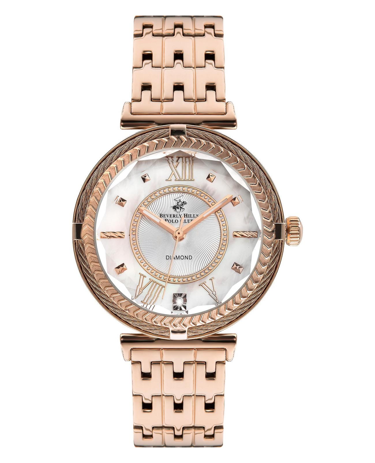 Часы Beverly Hills Polo Club BP3222X.420 — элегантная женская модель, сочетающая стиль и функциональность. Корпус диаметром 36 мм выполнен из нержавеющей стали с PVD-покрытиемPVDУльтратонкое покрытие наносится в технике вакуумного напыления, сочетает в себе нитрид титана особой прочности со слоем золота или оксида хрома. Несёт в себе декоративную или защитную функцию. розового золота. Белый циферблат с аналоговой индикацией и декоративными элементами защищён минеральным стекломМинеральное стеклоМинеральное стекло представляет собой искусственно выращенный минерал кварца. Такое стекло отличается особой устойчивостью к повреждениям и царапинам. Уступает по некоторым качествам сапфировому стеклу., устойчивым к царапинам.