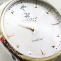 Американские женские часы с минеральным стекломМинеральное стеклоМинеральное стекло представляет собой искусственно выращенный минерал кварца. Такое стекло отличается особой устойчивостью к повреждениям и царапинам. Уступает по некоторым качествам сапфировому стеклу. Beverly Hills Polo Club BP3390C.520, кварцевый механизм с высокой точностью. Корпус и браслет часов изготовлены из нержавеющей стали с частичным IP-покрытиемIP-покрытиеМетод ионного напыления. Демонстрирует повышенную устойчивость к истиранию, окислению и химическим веществам. Под воздействием высокого давления и температуры около 1500°C молекулы металла надёжно соединяются с частицами корпуса часов.. Неподвижный безельБезельВнешний ободок, закрепляющий стекло. В спортивных часах так называется поворотное кольцо с делениями на циферблате, выполняет роль таймера – замеряет отрезки времени на шкале. Неподвижный безель – элемент декора. Однонаправленно вращающийся безель на дайверских часах позволяет фиксировать моменты погружения и выныривания на поверхность. из нержавеющей стали IP-покрытиемIP-покрытиеМетод ионного напыления. Демонстрирует повышенную устойчивость к истиранию, окислению и химическим веществам. Под воздействием высокого давления и температуры около 1500°C молекулы металла надёжно соединяются с частицами корпуса часов.. Циферблат украшен бриллиантом. Класс водозащиты: 50 метров, позволит защитить корпус от случайных брызг или капель дождя. Стальной браслет на раскладной застёжкеРаскладная застёжкаТакой тип застёжки используется только на браслетах из металла. Она никогда не раскрывается полностью, происходит разделение на 2 и более частей. Раскладывающая застёжка снизит вероятность потери часов к минимуму..