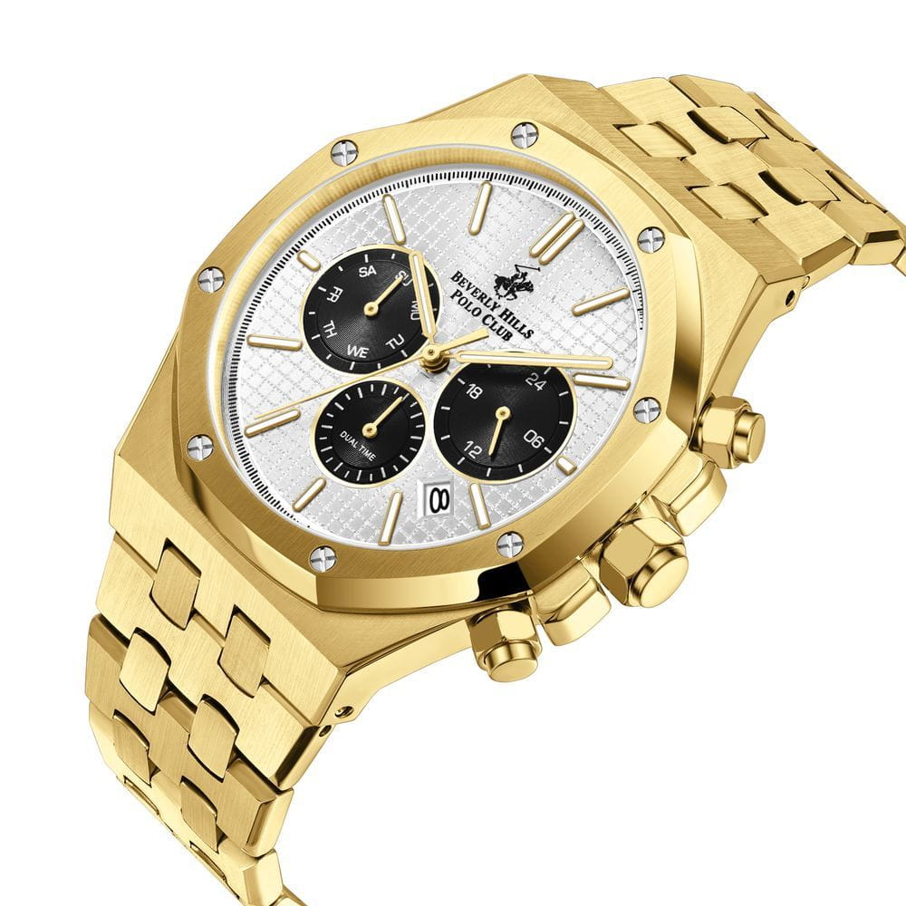 Beverly Hills Polo Club BP3051X.131 — выразительная модель с подчёркнуто мужским характером, в элегантном золотистом оттенке и строгих геометриях корпуса. Корпус диаметром около 42 мм из нержавеющей стали с аппликацией IP-покрытияIP-покрытиеМетод ионного напыления. Демонстрирует повышенную устойчивость к истиранию, окислению и химическим веществам. Под воздействием высокого давления и температуры около 1500°C молекулы металла надёжно соединяются с частицами корпуса часов. оформлен в современной октагональной форме, вызывая ассоциации с принципиальным архитектурным стилем .