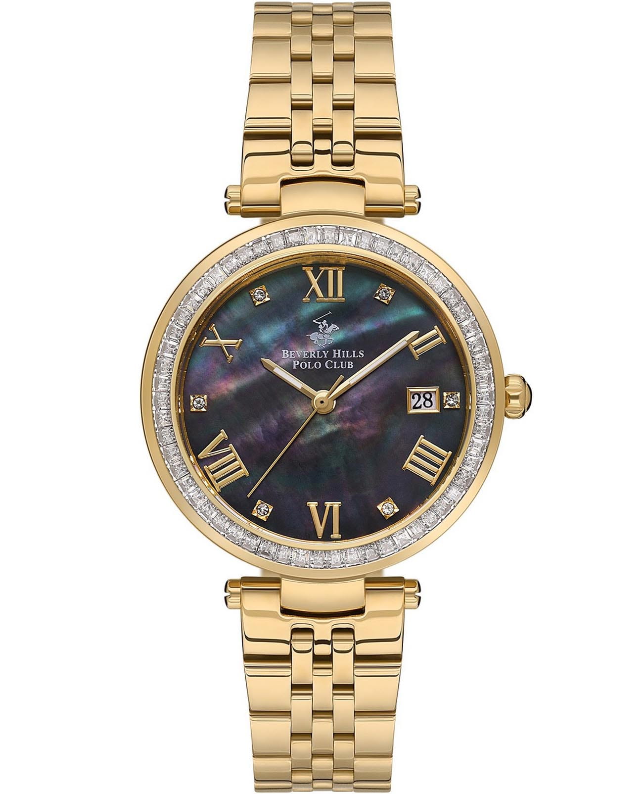 Женские наручные часы Beverly Hills Polo Club BP3583X.120 с надёжным автоматическим механизмом. Минеральное стеклоМинеральное стеклоМинеральное стекло представляет собой искусственно выращенный минерал кварца. Такое стекло отличается особой устойчивостью к повреждениям и царапинам. Уступает по некоторым качествам сапфировому стеклу. устойчивое к мелким механическим повреждениям. Корпус и браслет часов изготовлены из нержавеющей стали с IP-покрытиемIP-покрытиеМетод ионного напыления. Демонстрирует повышенную устойчивость к истиранию, окислению и химическим веществам. Под воздействием высокого давления и температуры около 1500°C молекулы металла надёжно соединяются с частицами корпуса часов.. Стальной браслет на раскладной застёжкеРаскладная застёжкаТакой тип застёжки используется только на браслетах из металла. Она никогда не раскрывается полностью, происходит разделение на 2 и более частей. Раскладывающая застёжка снизит вероятность потери часов к минимуму.. Окошко даты находится в положении 3 часа. Класс водозащиты: 50 метров, позволит защитить корпус от случайных брызг или капель дождя. Циферблат и безельБезельВнешний ободок, закрепляющий стекло. В спортивных часах так называется поворотное кольцо с делениями на циферблате, выполняет роль таймера – замеряет отрезки времени на шкале. Неподвижный безель – элемент декора. Однонаправленно вращающийся безель на дайверских часах позволяет фиксировать моменты погружения и выныривания на поверхность. инкрустированы кристаллами циркония.