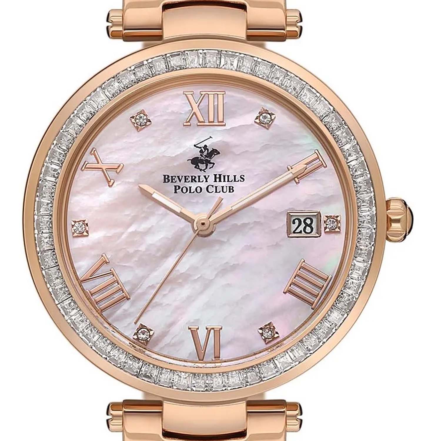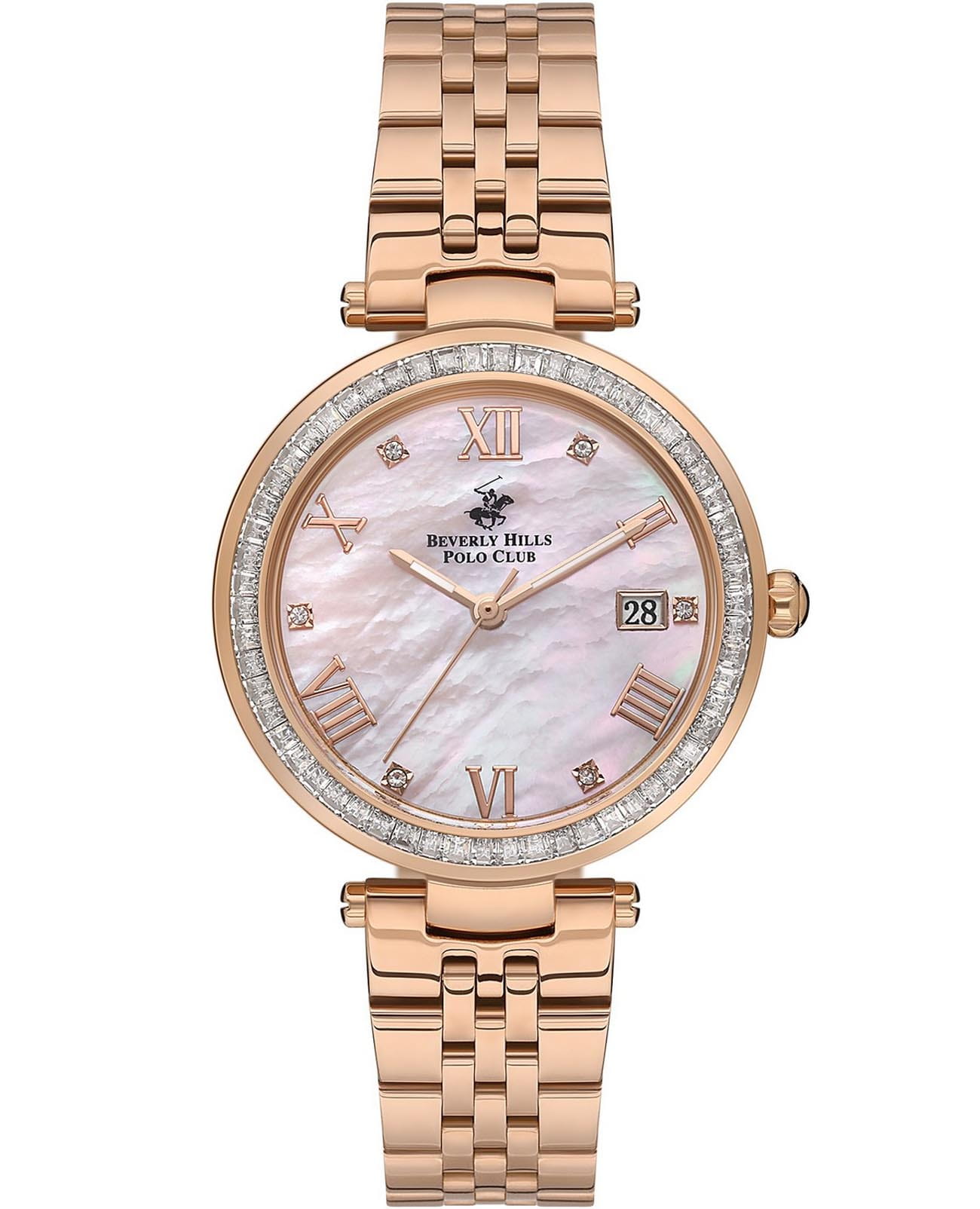 Женские наручные часы Beverly Hills Polo Club BP3583X.480 с надёжным автоматическим механизмом. Минеральное стеклоМинеральное стеклоМинеральное стекло представляет собой искусственно выращенный минерал кварца. Такое стекло отличается особой устойчивостью к повреждениям и царапинам. Уступает по некоторым качествам сапфировому стеклу. устойчивое к мелким механическим повреждениям. Корпус и браслет часов изготовлены из нержавеющей стали с IP-покрытиемIP-покрытиеМетод ионного напыления. Демонстрирует повышенную устойчивость к истиранию, окислению и химическим веществам. Под воздействием высокого давления и температуры около 1500°C молекулы металла надёжно соединяются с частицами корпуса часов.. Стальной браслет на раскладной застёжкеРаскладная застёжкаТакой тип застёжки используется только на браслетах из металла. Она никогда не раскрывается полностью, происходит разделение на 2 и более частей. Раскладывающая застёжка снизит вероятность потери часов к минимуму.. Окошко даты находится в положении 3 часа. Класс водозащиты: 50 метров, позволит защитить корпус от случайных брызг или капель дождя. Циферблат и безельБезельВнешний ободок, закрепляющий стекло. В спортивных часах так называется поворотное кольцо с делениями на циферблате, выполняет роль таймера – замеряет отрезки времени на шкале. Неподвижный безель – элемент декора. Однонаправленно вращающийся безель на дайверских часах позволяет фиксировать моменты погружения и выныривания на поверхность. инкрустированы кристаллами циркония.