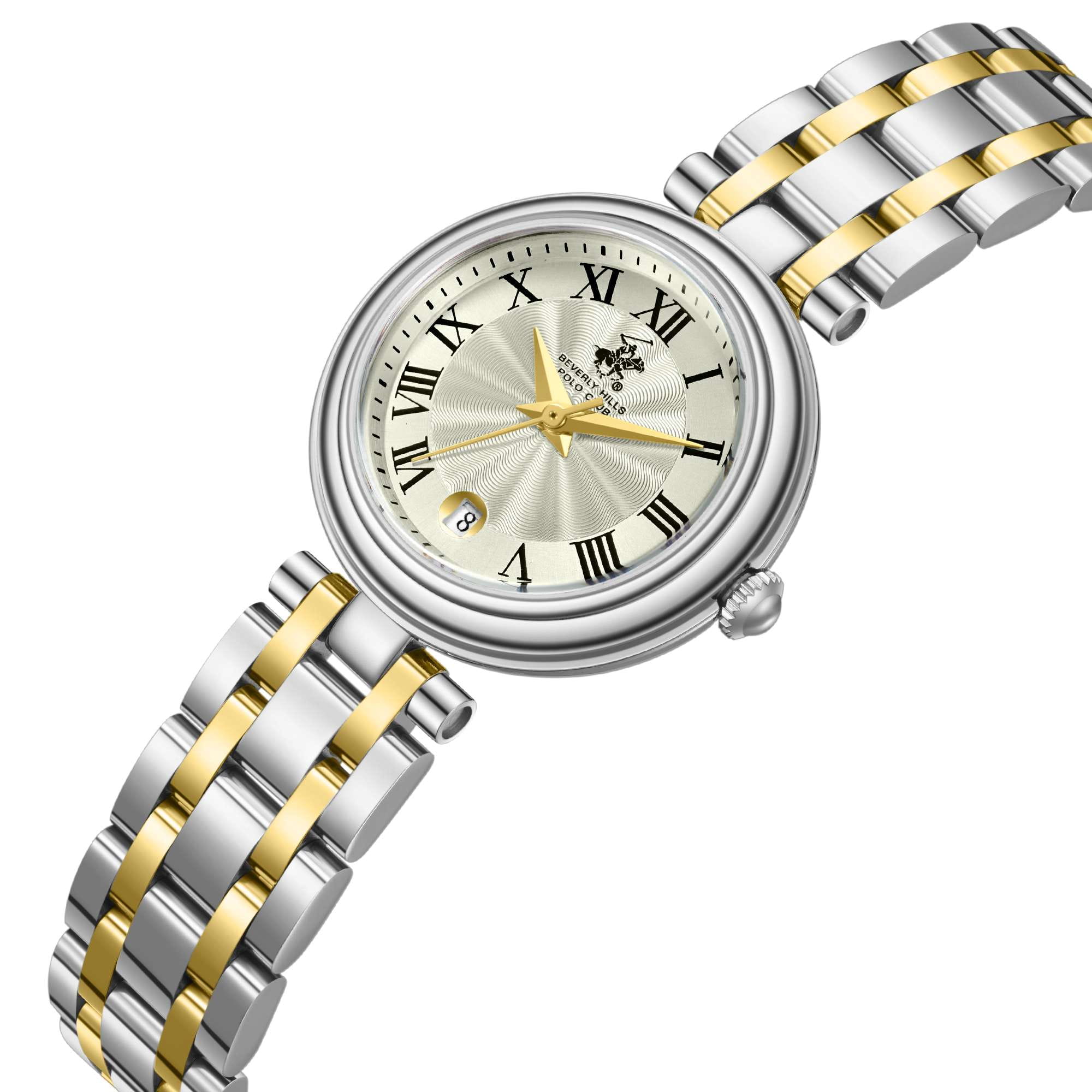 Женские кварцевые часы Beverly Hills Polo Club — это элегантный аксессуар. Корпус диаметром 26 мм выполнен из нержавеющей стали. Циферблат оформлен индексами и стрелками. Окошко даты расположено в положении 6 часов. Циферблат защищён минеральным стекломМинеральное стеклоМинеральное стекло представляет собой искусственно выращенный минерал кварца. Такое стекло отличается особой устойчивостью к повреждениям и царапинам. Уступает по некоторым качествам сапфировому стеклу.. Часы оснащены стальным браслетом с частичным IP-покрытиемIP-покрытиеМетод ионного напыления. Демонстрирует повышенную устойчивость к истиранию, окислению и химическим веществам. Под воздействием высокого давления и температуры около 1500°C молекулы металла надёжно соединяются с частицами корпуса часов. на застёжке «бабочка» с кнопкамиЗастёжка "бабочка"Такой вид застёжки дополняется предохранителями, помогающими избежать случайного раскрытия браслета. Обладают изящным исполнением. . Водонепроницаемость 30 м позволяет использовать часы в повседневных условиях. Идеальный выбор для тех, кто ценит стиль и качество.