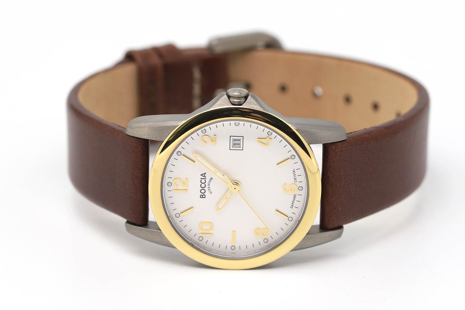 Женские наручные часы Boccia Titanium 3298-05 с надёжным кварцевым механизмом. Сапфировое стеклоСапфировое стеклоПрочный и надёжный материал из кристалла сапфира синтетического происхождения, характеризующийся особой твёрдостью и устойчивостью к царапинам и повреждениям. устойчивое к мелким механическим повреждениям. Корпус часов изготовлен из титана. Кожаный ремешок на стандартной застёжке. Класс водозащиты: 50 метров, позволит защитить корпус от случайных брызг или капель дождя. Окошко даты находится в положении 3 часа. Стрелки и метки с люминесцентным покрытиемЛюминесцентное покрытиеПозволяет считывать показания времени в темноте. Производители наносят на стрелки, часовые индексы, безель или поверхность циферблата светонакопительный состав, дающий холодное свечение.. Титановый безельБезельВнешний ободок, закрепляющий стекло. В спортивных часах так называется поворотное кольцо с делениями на циферблате, выполняет роль таймера – замеряет отрезки времени на шкале. Неподвижный безель – элемент декора. Однонаправленно вращающийся безель на дайверских часах позволяет фиксировать моменты погружения и выныривания на поверхность. с PVD-покрытиемPVDУльтратонкое покрытие наносится в технике вакуумного напыления, сочетает в себе нитрид титана особой прочности со слоем золота или оксида хрома. Несёт в себе декоративную или защитную функцию..