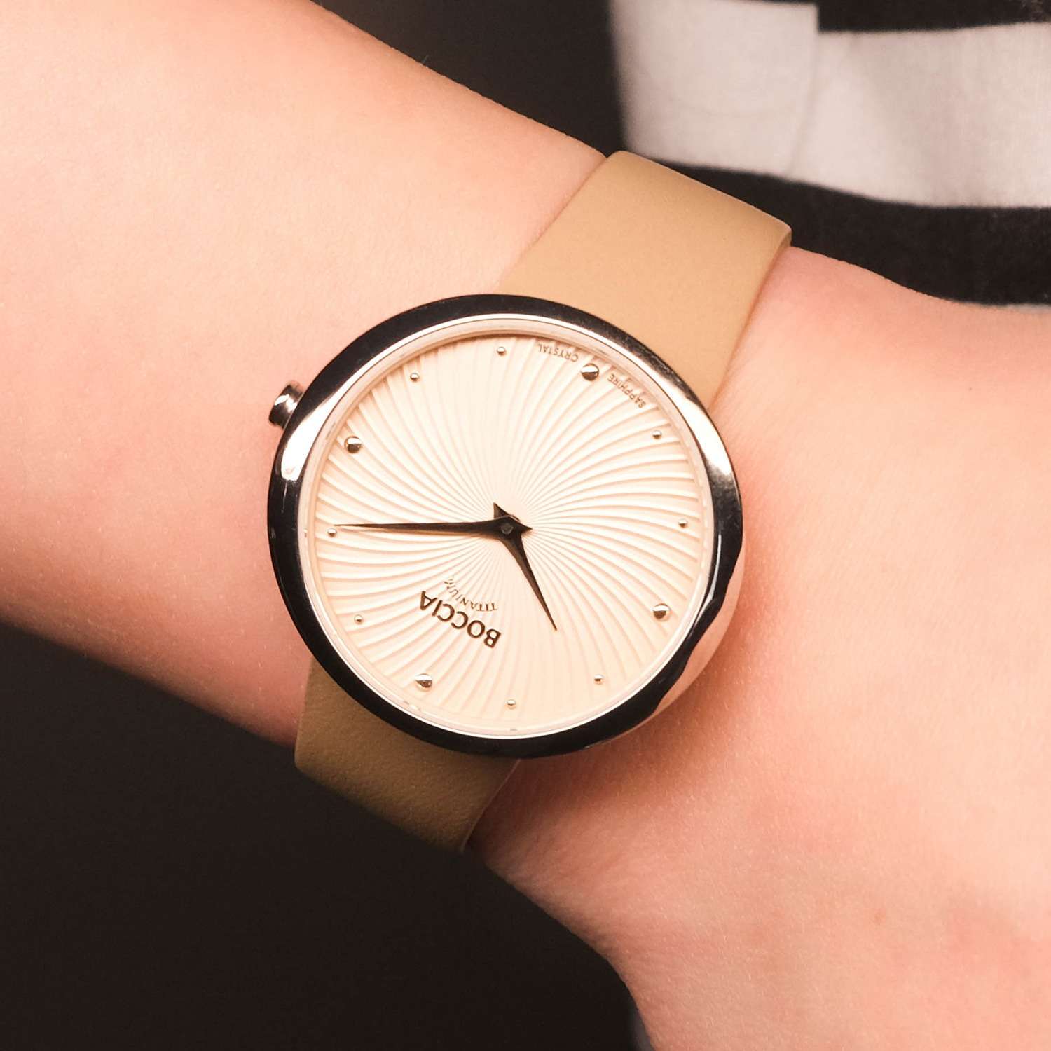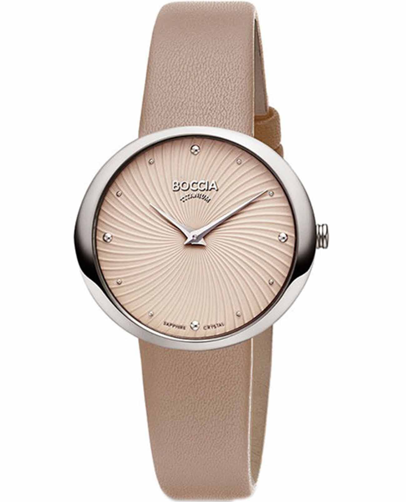 Женские часы Boccia Titanium 3364-02 станут прекрасным дополнением вашего стильного образа. Эти часы оснащены надежным кварцевым механизмом Miyota GL22, обеспечивающим точное время. Центральные часовая и минутная стрелки аккуратно выделяются на бежевом гильошированном циферблате, придавая часам элегантный вид. Корпус часов выполнен из суперлегкого титана, что делает их не только прочными, но и невероятно комфортными в ношении. Овальная форма корпуса размером 30 х 32 мм добавляет изысканности и утонченности. Бежевый кожаный ремешок с классической застежкой гармонично дополняет общий стиль часов. Сапфировое стеклоСапфировое стеклоПрочный и надёжный материал из кристалла сапфира синтетического происхождения, характеризующийся особой твёрдостью и устойчивостью к царапинам и повреждениям., устойчивое к появлению царапин, надежно защищает циферблат, обеспечивая долговечность и сохранение первоначального внешнего вида. Водостойкость уровня WR 50 позволяет не беспокоиться о попадании влаги при мытье рук или в дождливую погоду.
