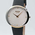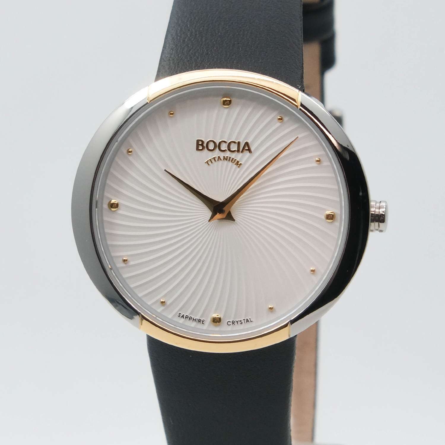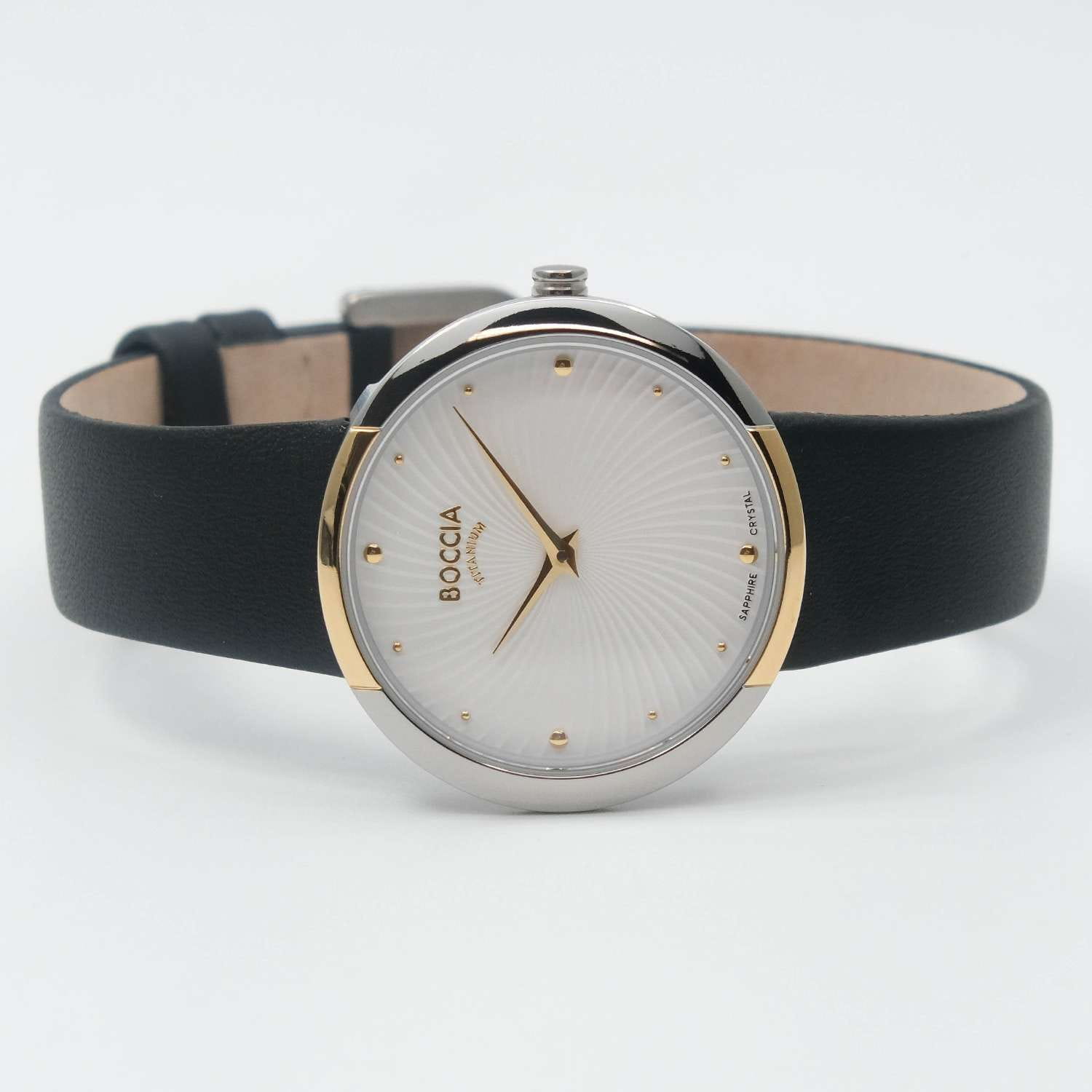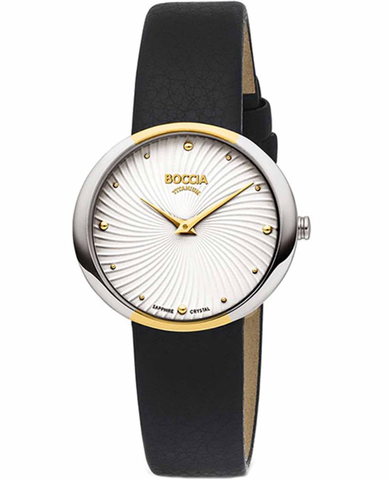 Женские часы Boccia Titanium 3364-03 станут прекрасным дополнением вашего стильного образа. Эти часы оснащены надежным кварцевым механизмом Miyota GL22, обеспечивающим точное время. Центральные часовая и минутная стрелки аккуратно выделяются на белом гильошированном циферблате, придавая часам элегантный вид. Корпус часов выполнен из суперлегкого титана с частичным PVDPVDУльтратонкое покрытие наносится в технике вакуумного напыления, сочетает в себе нитрид титана особой прочности со слоем золота или оксида хрома. Несёт в себе декоративную или защитную функцию.-покрытием цвета желтого золота, что делает их не только прочными, но и невероятно комфортными в ношении. Овальная форма корпуса размером 30 х 32 мм добавляет изысканности и утонченности. Черный кожаный ремешок с классической застежкой гармонично дополняет общий стиль часов. Сапфировое стеклоСапфировое стеклоПрочный и надёжный материал из кристалла сапфира синтетического происхождения, характеризующийся особой твёрдостью и устойчивостью к царапинам и повреждениям., устойчивое к появлению царапин, надежно защищает циферблат, обеспечивая долговечность и сохранение первоначального внешнего вида. Водостойкость уровня WR 50 позволяет не беспокоиться о попадании влаги при мытье рук или в дождливую погоду.