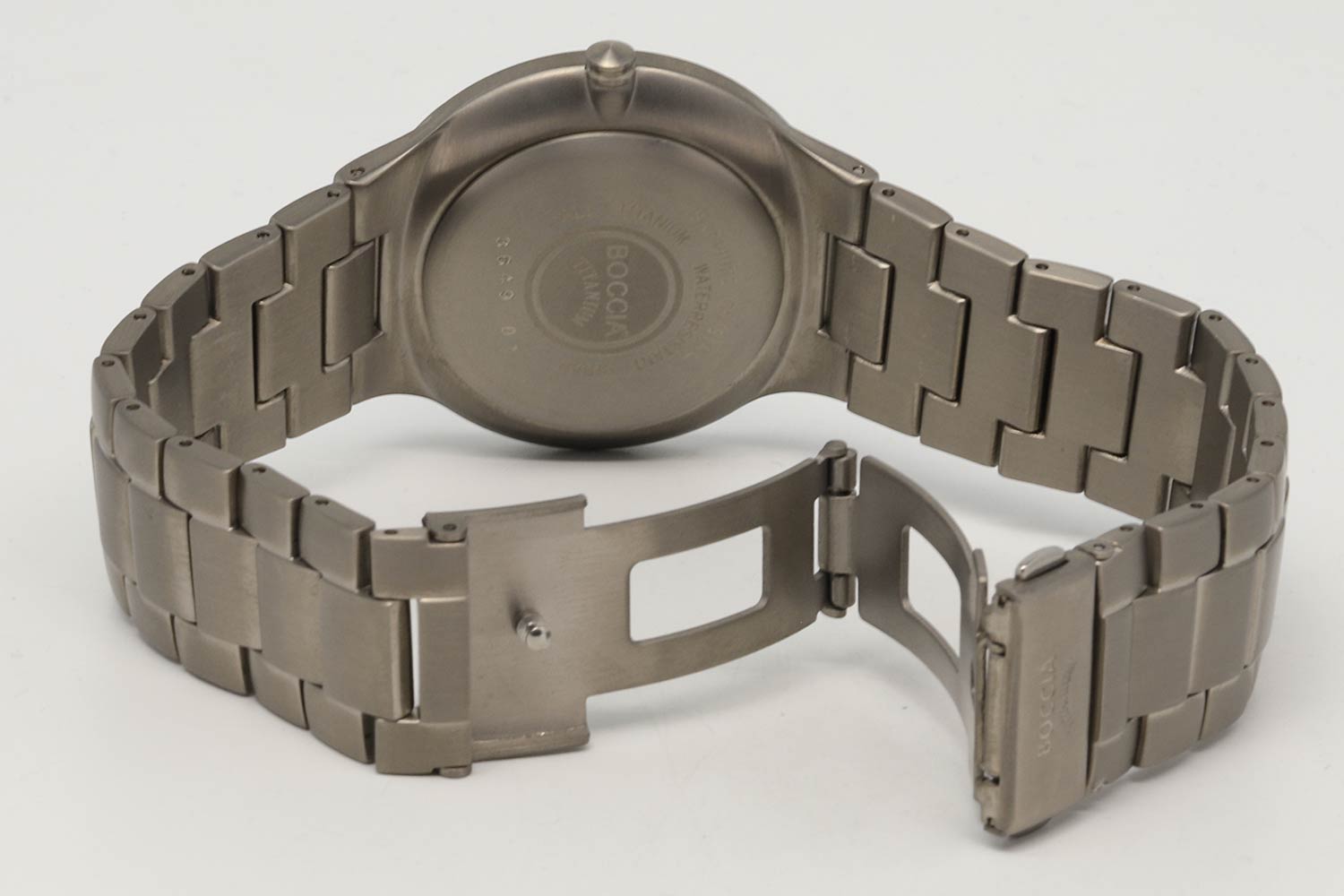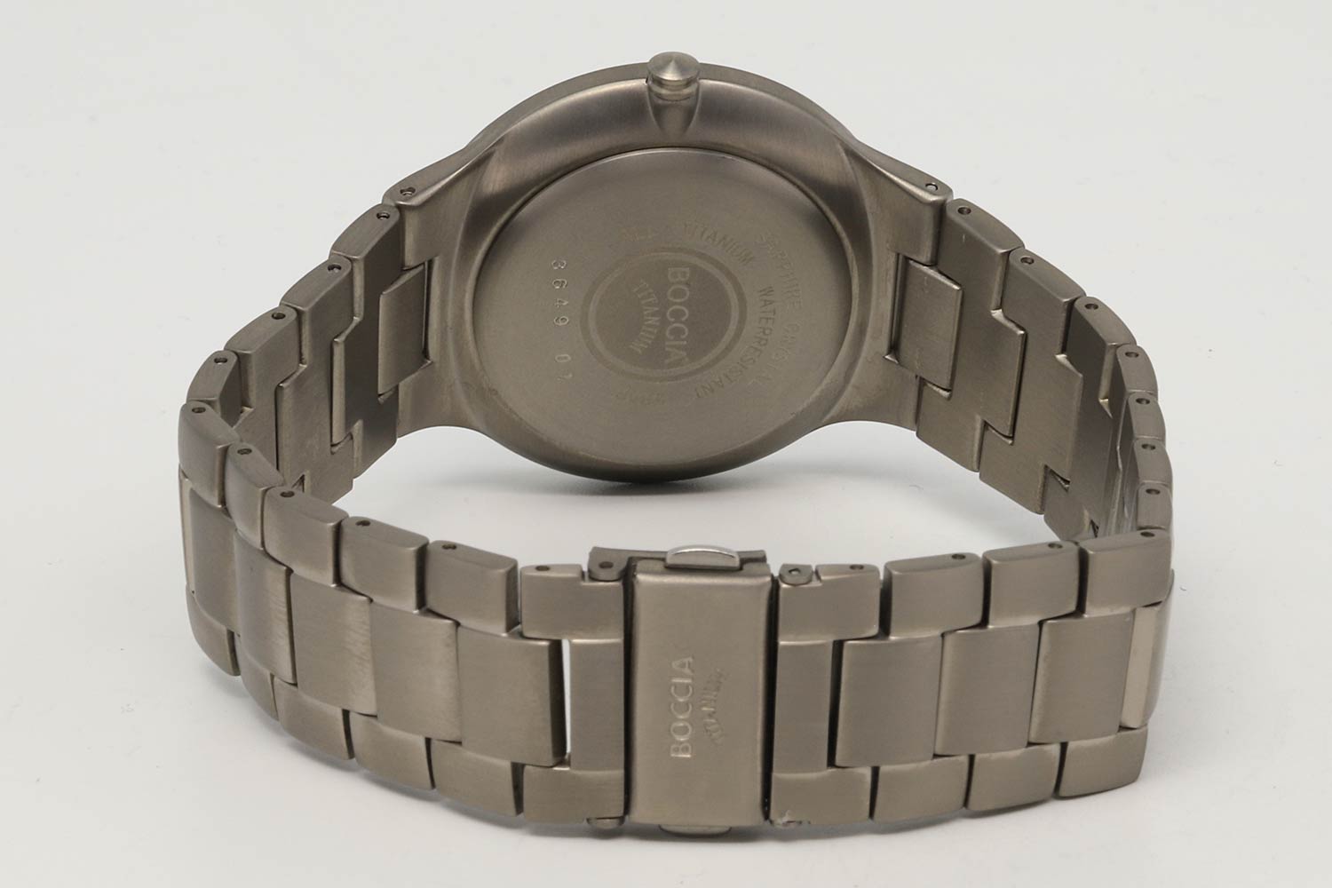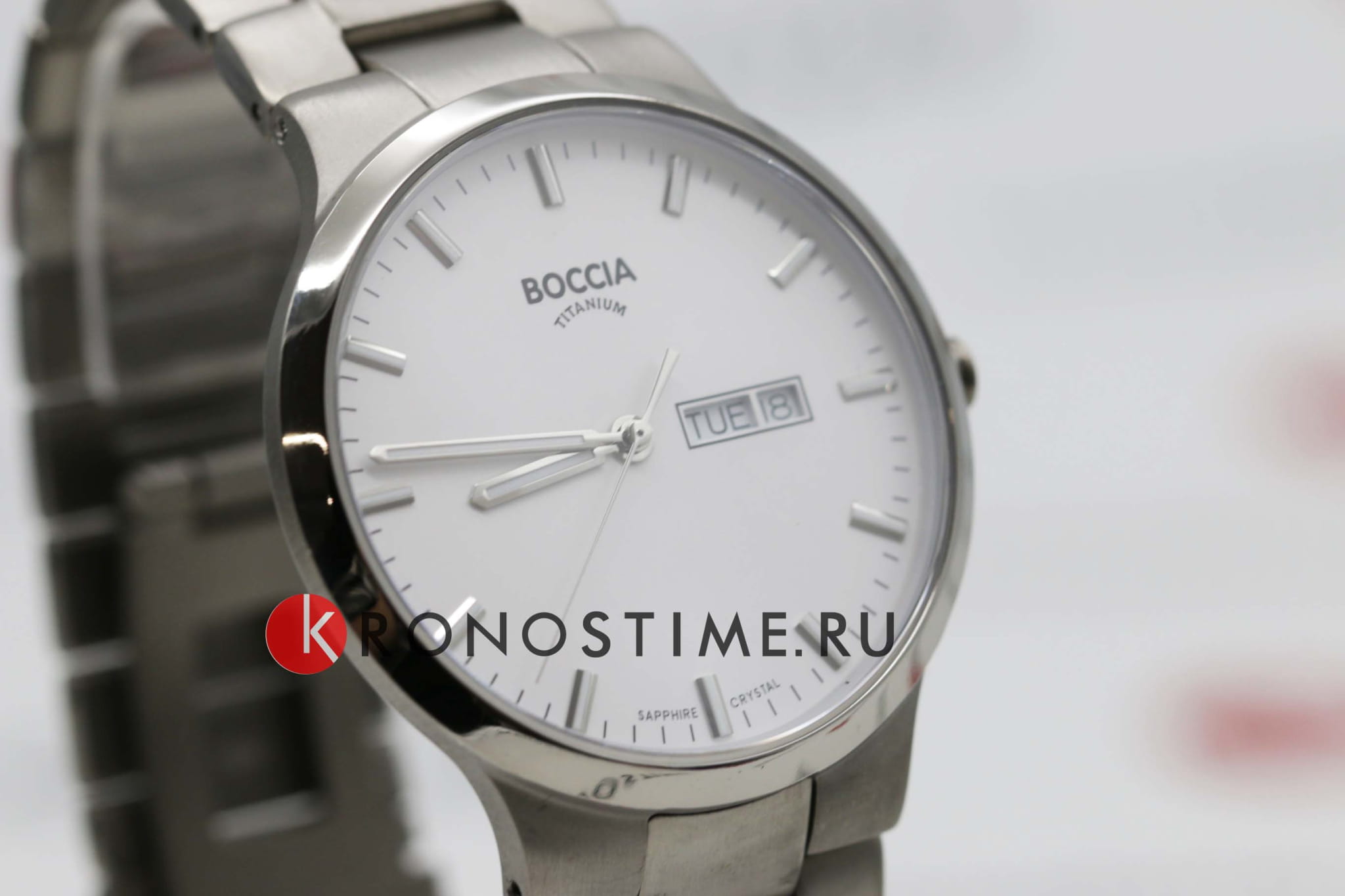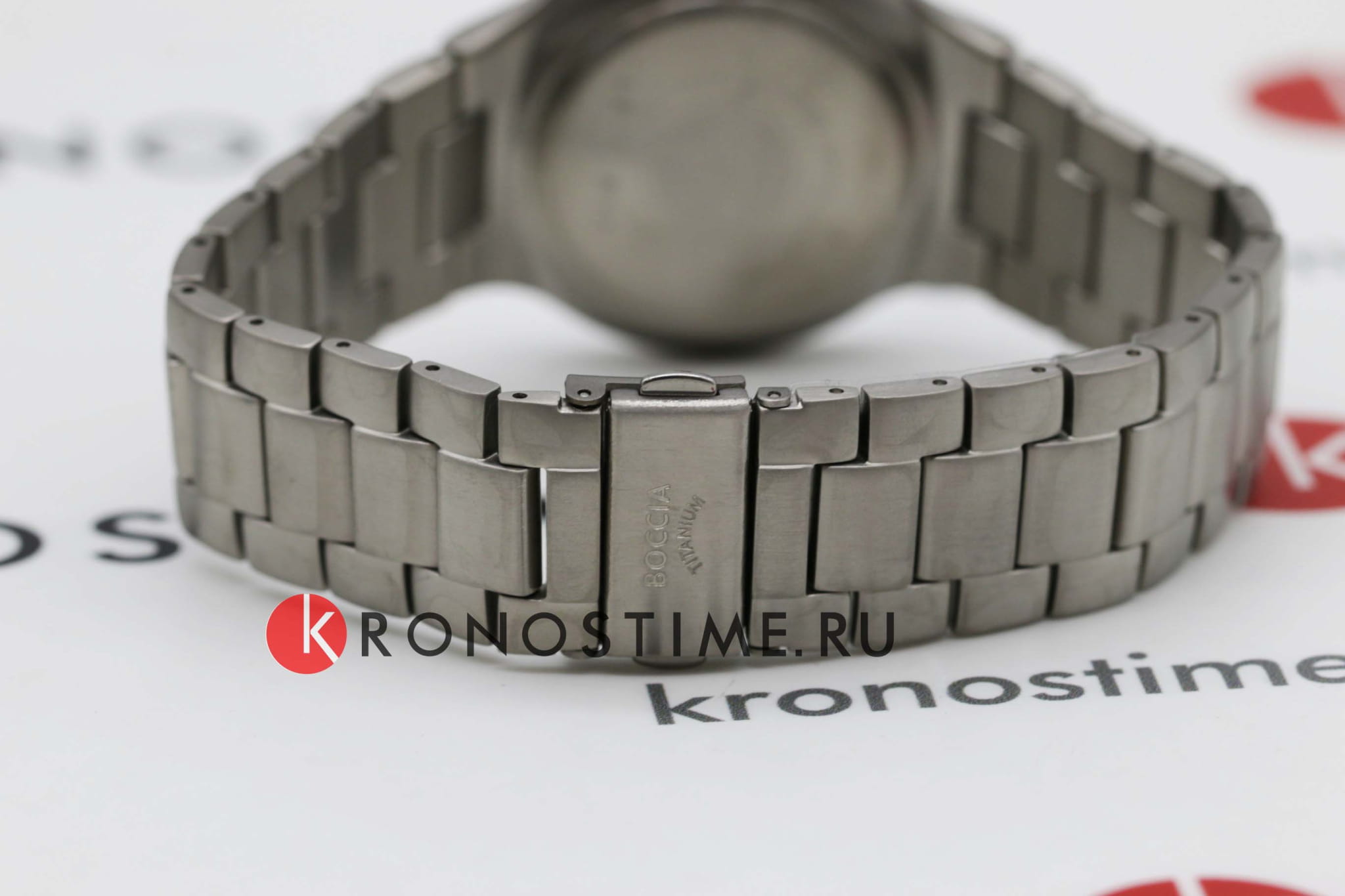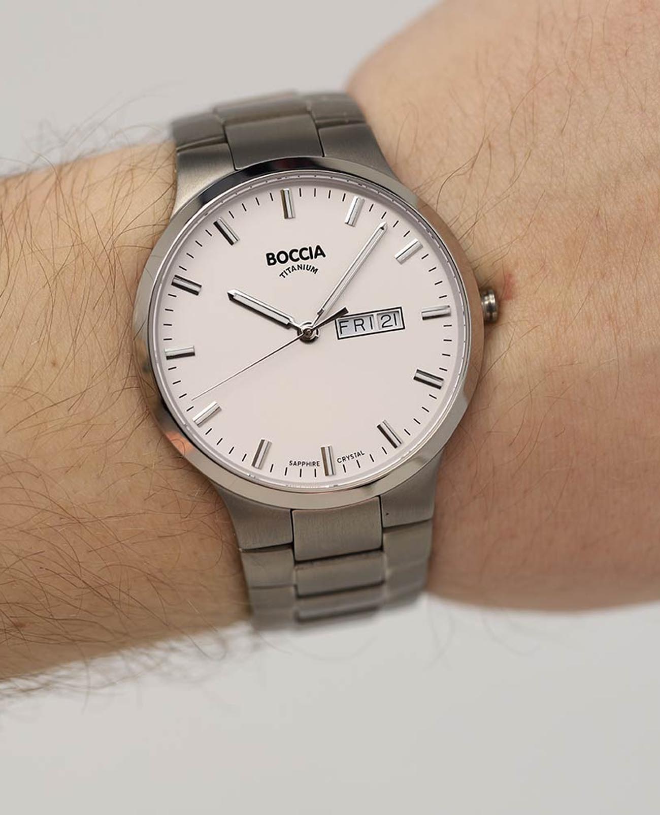 Мужские наручные часы Boccia Titanium 3649-01 с надёжным кварцевым механизмом. Сапфировое стеклоСапфировое стеклоПрочный и надёжный материал из кристалла сапфира синтетического происхождения, характеризующийся особой твёрдостью и устойчивостью к царапинам и повреждениям. устойчивое к мелким механическим повреждениям. Корпус и браслет часов изготовлены из титана. Титановый браслет на раскладной застёжкеРаскладная застёжкаТакой тип застёжки используется только на браслетах из металла. Она никогда не раскрывается полностью, происходит разделение на 2 и более частей. Раскладывающая застёжка снизит вероятность потери часов к минимуму.. Класс водозащиты: 50 метров, позволит защитить корпус от случайных брызг или капель дождя. Стрелки и метки с люминесцентным покрытиемЛюминесцентное покрытиеПозволяет считывать показания времени в темноте. Производители наносят на стрелки, часовые индексы, безель или поверхность циферблата светонакопительный состав, дающий холодное свечение.. Окошки дня недели и даты находятся в положении 3 часа.