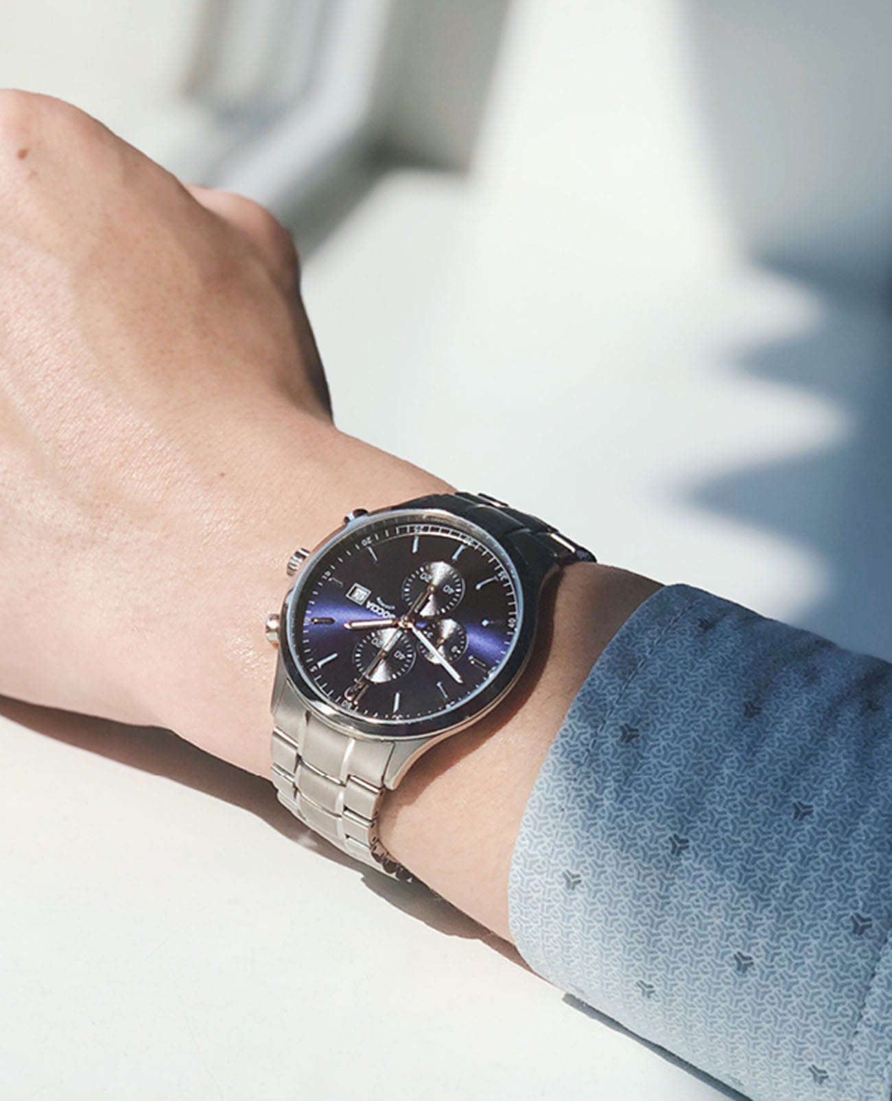 Мужские немецкие титановые часы-хронографХронографФункция позволяет измерять отрезки времени с особой точностью: часы, минуты, секунды. Верным признаком хронографа является наличие на циферблате 3 дополнительных окошек-счётчиков. с секундомеромСекундомерСекундоме́р — прибор, способный измерять интервалы времени с точностью до долей секунды. Boccia Titanium Circle-Oval 3753-03, кварцевый механизм с высокой точностью. Минеральное стеклоМинеральное стеклоМинеральное стекло представляет собой искусственно выращенный минерал кварца. Такое стекло отличается особой устойчивостью к повреждениям и царапинам. Уступает по некоторым качествам сапфировому стеклу. устойчивое к появлению царапин, обладающее высокой прозрачностью. Корпус изготовлен из титана. На цифрблате расположены три дополнительных индикатора и окошко даты. Стрелки с люминесцентным покрытиемЛюминесцентное покрытиеПозволяет считывать показания времени в темноте. Производители наносят на стрелки, часовые индексы, безель или поверхность циферблата светонакопительный состав, дающий холодное свечение.. Класс водозащиты: 50 метров, позволит защитить корпус от случайных брызг или капель дождя. Браслет из титана на раскладной застёжкеРаскладная застёжкаТакой тип застёжки используется только на браслетах из металла. Она никогда не раскрывается полностью, происходит разделение на 2 и более частей. Раскладывающая застёжка снизит вероятность потери часов к минимуму..