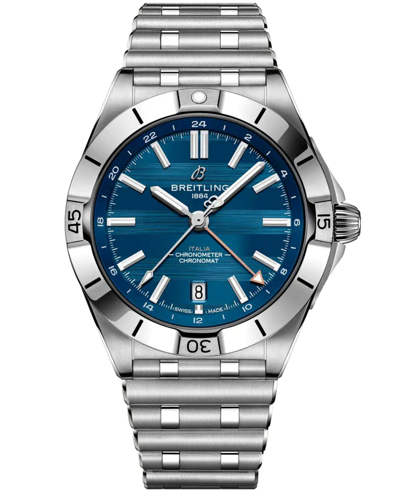 Мужские механические часы Breitling Chronomat A323981C1C1A1— это роскошный аксессуар, сочетающий в себе классический стиль и передовые технологии. Модель выполнена из нержавеющей стали с диаметром корпуса 40 мм и толщиной 11,77 мм, что делает её прочной и устойчивой к царапинам. Циферблат синего цвета дополнен индикатором второго часового пояса, а его поверхность защищена выпуклым сапфировым стекломСапфировое стеклоПрочный и надёжный материал из кристалла сапфира синтетического происхождения, характеризующийся особой твёрдостью и устойчивостью к царапинам и повреждениям. с двусторонним антибликовым покрытиемАнтибликовое покрытиеСлой оксида металла в 0,13-0,3 микрон, благодаря которому стекло часов не бликует и не отражает свет. Антибликовое покрытие уменьшает отражение света в 10 раз, обеспечивая отличную читаемость показателей циферблата., устойчивым к повреждениям. Задняя крышка завинчивается, а заводная головка завинченная, с двумя прокладками, что обеспечивает надёжную фиксацию на запястье. Часы оснащены автоматическим механизмом Breitling Caliber 32, обеспечивающим запас хода до 42 часов и частоту колебаний 28 800 полуколебаний в час. Функции включают отображение времени и второй часовой пояс. Водонепроницаемость позволяет использовать модель при плавании и других водных активностях без глубокого погружения. Браслет из нержавеющей стали шириной 20 мм оснащён застёжкой «бабочка» с кнопкамиЗастёжка "бабочка"Такой вид застёжки дополняется предохранителями, помогающими избежать случайного раскрытия браслета. Обладают изящным исполнением. , обеспечивающей комфорт и надёжную фиксацию на запястье. На задней крышке выгравирован логотип команды, которой посвящена модель, и надпись «Один из 250». Это лимитированная серия, выпущенная всего 250 экземпляров, что подчёркивает её уникальность. Гарантия 2 года подтверждает качество и долговечность изделия. Эти часы станут универсальным аксессуаром для тех, кто ценит сочетание стиля, функциональности и надёжности — идеальный выбор для повседневной носки и активного образа жизни.