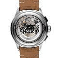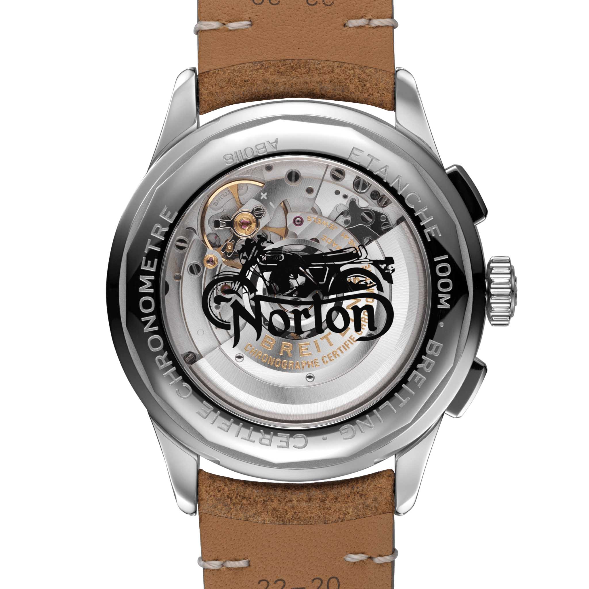 Модель Breitling Premier B01 Chronograph 42 Norton Edition – результат сотрудничества компании Breitling с британским производителем культовых мотоциклов Norton. Стильный харизматичный дизайн этого хронометра воплощает инновационный и смелый характер обоих брендов. Левая сторона корпуса украшена гравировкой Norton, а прозрачная задняя крышка – изображением мотоцикла и фирменным логотипом. Модель оснащена мануфактурным механизмом Breitling Manufacture Caliber 01, сертифицированным Швейцарским институтом официального тестирования хронометров (COSC). Водонепроницаемость часов – до 10 бар (100 метров). В 42-миллиметровый корпус из нержавеющей стали установлен черный циферблат с контрастными дополнительными счетчиками белого цвета, на фоне которых элегантно выделяются арабские цифры, а также часовая и минутная стрелки с матовым покрытием золотистого цвета. Цветовое решение подчеркивает динамичность и элегантность модели как в комплекте с коричневым ремешком из сыромятной кожи, так и с браслетом из нержавеющей стали.