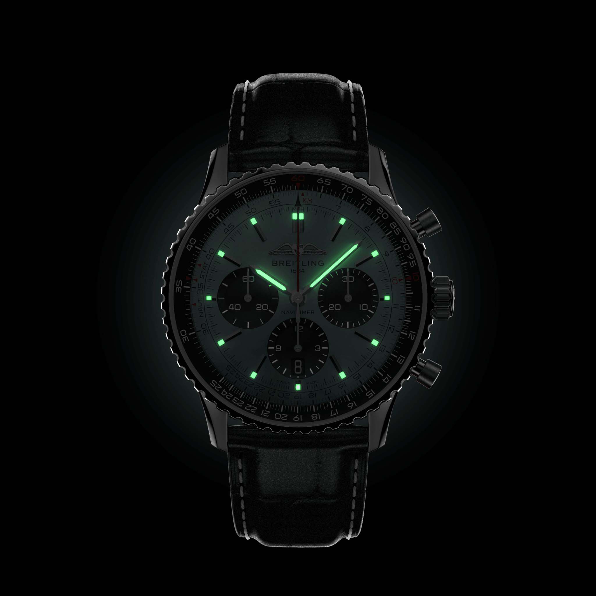 Мужские швейцарские часы-хронографХронографФункция позволяет измерять отрезки времени с особой точностью: часы, минуты, секунды. Верным признаком хронографа является наличие на циферблате 3 дополнительных окошек-счётчиков. с секундомеромСекундомерСекундоме́р — прибор, способный измерять интервалы времени с точностью до долей секунды. Breitling Navitimer B01 Chronograph 43 AB0138241C1P1, механический механизм (автоматический калибр) с высокой точностью. Сапфировое стеклоСапфировое стеклоПрочный и надёжный материал из кристалла сапфира синтетического происхождения, характеризующийся особой твёрдостью и устойчивостью к царапинам и повреждениям. с антибликовым покрытием устойчивое к появлению царапин, обладающее высокой прозрачностью. Класс водозащиты: 30 метров, позволит защитить корпус от случайных брызг или капель дождя. Корпус часов изготовлен из стали. Кожаный ремешок с раскладной застёжкойРаскладная застёжкаТакой тип застёжки используется только на браслетах из металла. Она никогда не раскрывается полностью, происходит разделение на 2 и более частей. Раскладывающая застёжка снизит вероятность потери часов к минимуму.. Шкала тахиметраТахиметрРазмеченная шкала, располагается на ободке или безеле часов. Тахиметр позволяет рассчитать скорость на определённом участке пути, расстояние измеряется в километрах или милях. на циферблате. Часы имеют сертификат COSCСертификат COSCОфициальный сертификат, подтверждающий то, что часы ходят с особо высокой точностью. Для получения документа часы подвергаются тестовым испытаниям, разработанным швейцарским институтом тестирования хронометров COSC. Допустимая норма для механических часов -4/+6 секунд в день, для кварцевых моделей +/- 0,07 секунд в день.. Окошко даты находится в положении 6 часов. Стрелки и метки с люминесцентным покрытиемЛюминесцентное покрытиеПозволяет считывать показания времени в темноте. Производители наносят на стрелки, часовые индексы, безель или поверхность циферблата светонакопительный состав, дающий холодное свечение..
