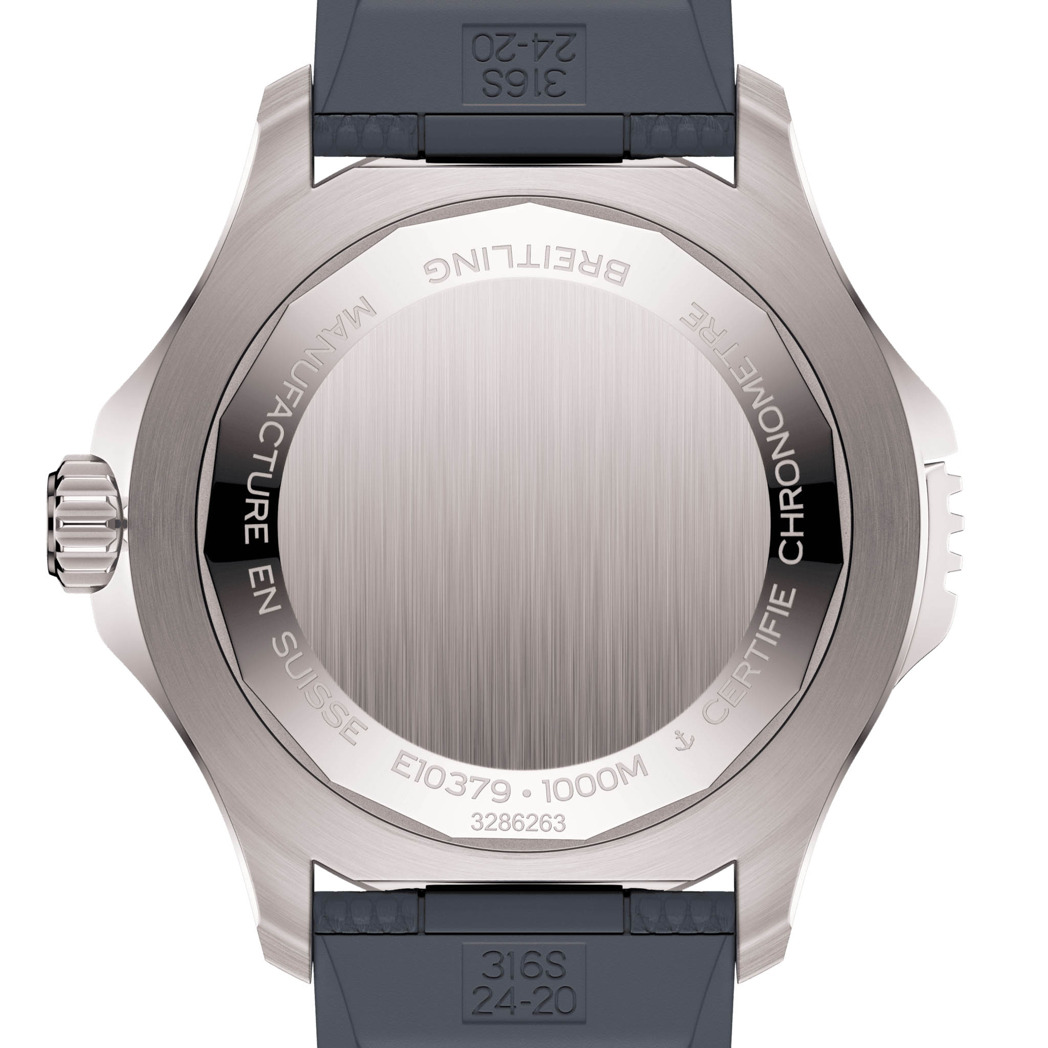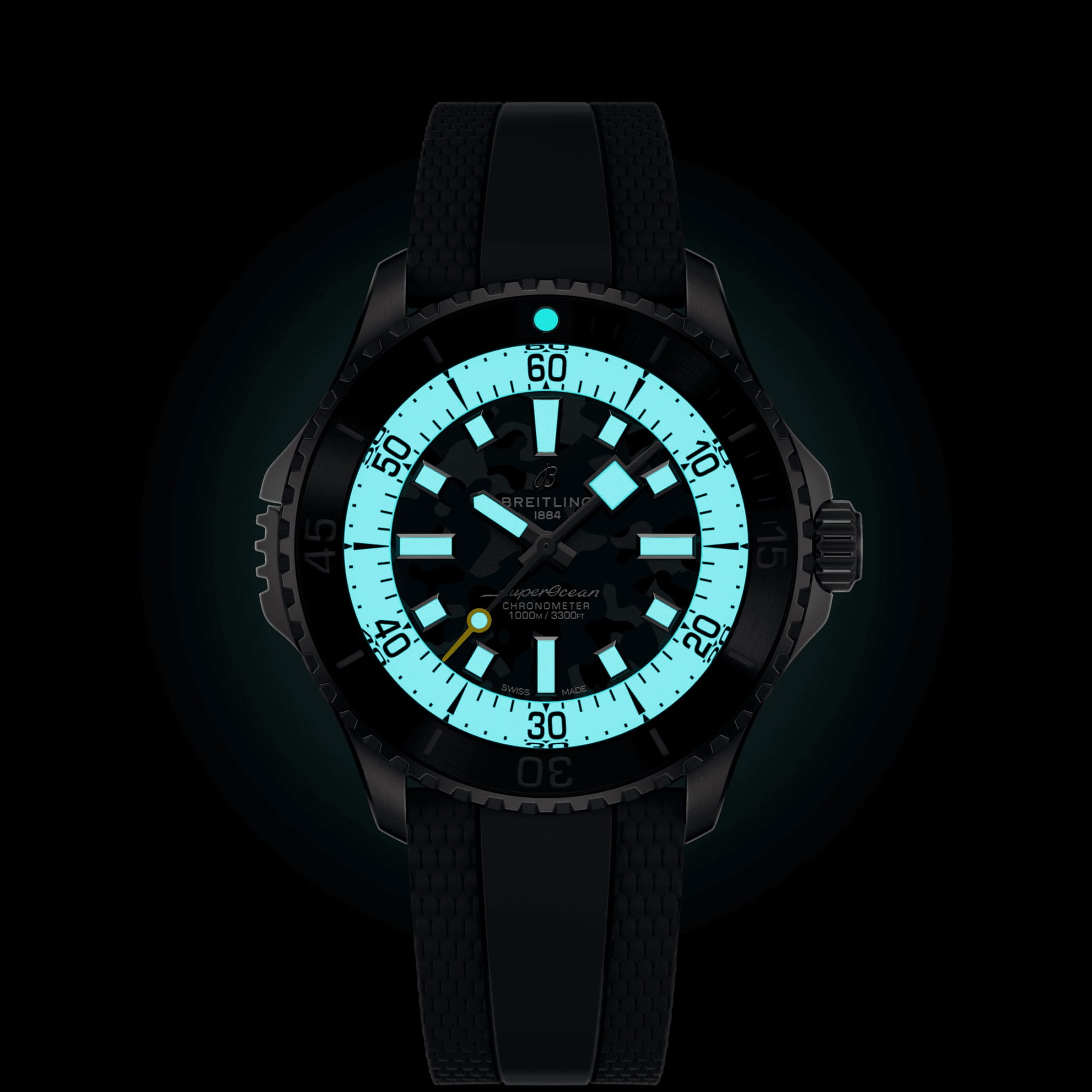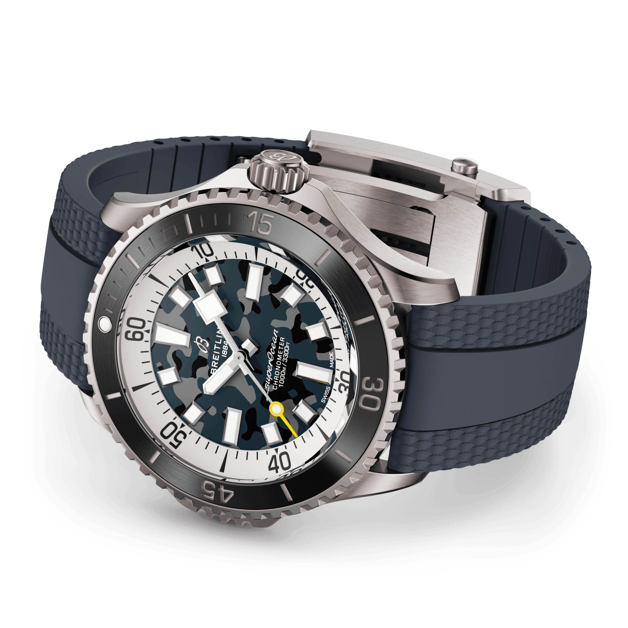 Мужские водонепроницаемые швейцарские часы Breitling Superocean Automatic 46 Super Diver E10379351B1S1, механический механизм (автоматический калибр) с высокой точностью. Сапфировое стеклоСапфировое стеклоПрочный и надёжный материал из кристалла сапфира синтетического происхождения, характеризующийся особой твёрдостью и устойчивостью к царапинам и повреждениям. устойчивое к появлению царапин, обладающее высокой прозрачностью. Класс водозащиты: 1000 метров, позволит плавать, нырять и заниматься другими водными видами спорта. Корпус часов изготовлен из титана. Титановй браслет с раскладной застёжкойРаскладная застёжкаТакой тип застёжки используется только на браслетах из металла. Она никогда не раскрывается полностью, происходит разделение на 2 и более частей. Раскладывающая застёжка снизит вероятность потери часов к минимуму.. Стрелки и метки с люминесцентным покрытиемЛюминесцентное покрытиеПозволяет считывать показания времени в темноте. Производители наносят на стрелки, часовые индексы, безель или поверхность циферблата светонакопительный состав, дающий холодное свечение.. Широкие стрелки и индексы с люминесцентным покрытиемЛюминесцентное покрытиеПозволяет считывать показания времени в темноте. Производители наносят на стрелки, часовые индексы, безель или поверхность циферблата светонакопительный состав, дающий холодное свечение. обеспечивают легкую читаемость под водой. Вращающийся стальной безельБезельВнешний ободок, закрепляющий стекло. В спортивных часах так называется поворотное кольцо с делениями на циферблате, выполняет роль таймера – замеряет отрезки времени на шкале. Неподвижный безель – элемент декора. Однонаправленно вращающийся безель на дайверских часах позволяет фиксировать моменты погружения и выныривания на поверхность. с люминесцентным покрытиемЛюминесцентное покрытиеПозволяет считывать показания времени в темноте. Производители наносят на стрелки, часовые индексы, безель или поверхность циферблата светонакопительный состав, дающий холодное свечение. Superluminova из нержавеющей стали и керамики, защищенный от царапин, никогда не изнашивается и не выцветает.