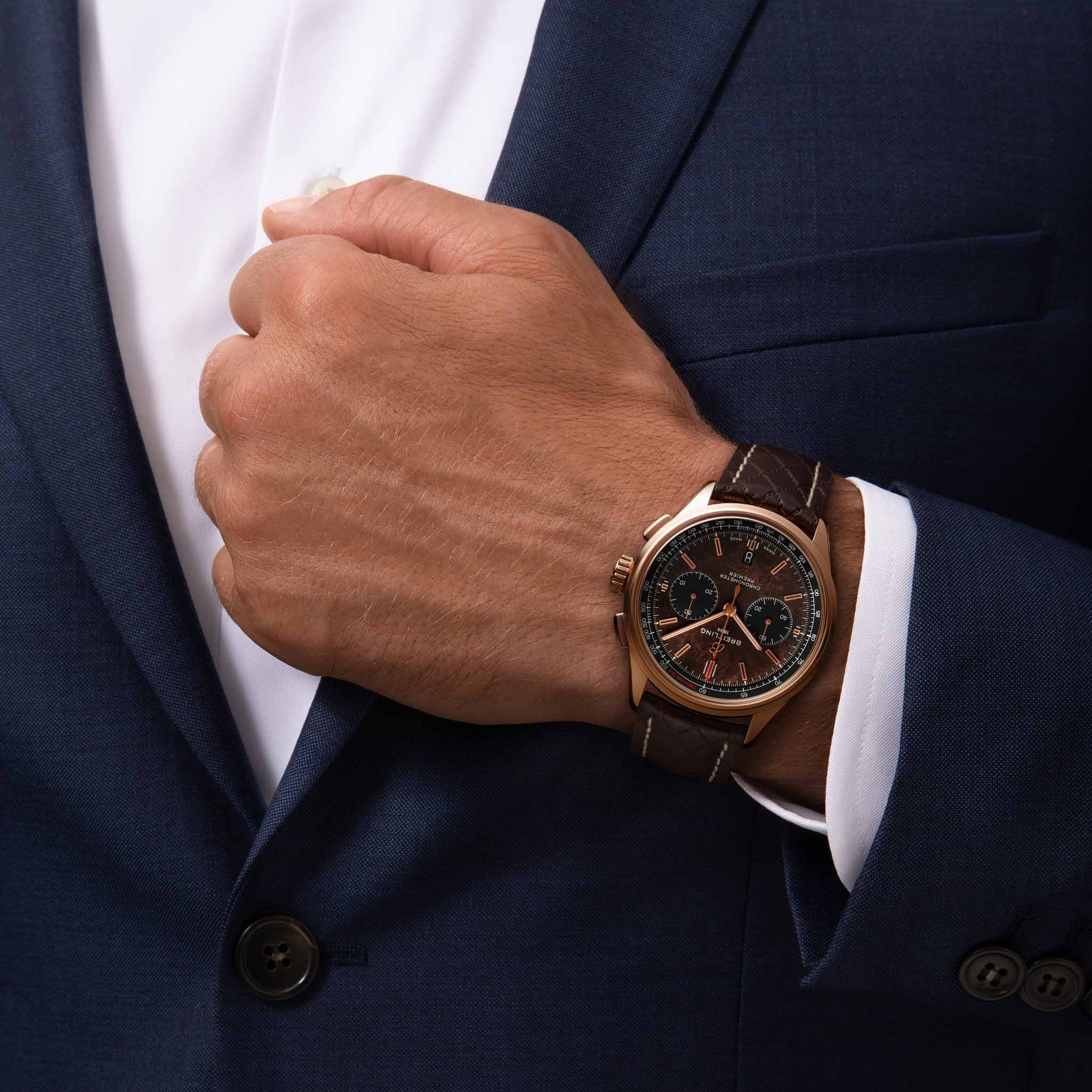 Модель Bentley Centenary Limited Edition в корпусе из 18-каратного розового золота дополнена коричневым ремешком из телячьей кожи с ромбовидным узором и отстрочкой, которые напоминают роскошные сидения Bentley. На основном циферблате расположены дополнительные циферблаты, выполненные в контрастном черном цвете, а также черный внутренний безель с белой тахиметрической шкалой и надписью TACHYMETER красного цвета. На левой стороне корпуса диаметром 42 мм располагается гравировка логотипа Bentley, дизайн которой напоминает приборную панель автомобиля Bentley Blower. Под корпусом из 18-каратного розового золота скрыт мануфактурный механизм Breitling Manufacture Caliber 01 – один из самых надежных калибров в часовой индустрии. За его работой можно наблюдать сквозь уникальную прозрачную заднюю крышку корпуса, украшенную логотипом Bentley. На задней крышке часов выгравирована надпись 1 OF 200.
