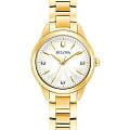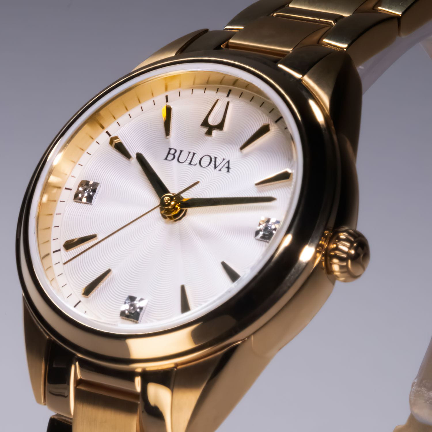 Женские кварцевые часы Bulova Sutton 97P150 – отражающий идеальное сочетание современного дизайна, надёжности и функциональности. Элегантный облик станет превосходным завершением образа, наделив его индивидуальным характером. Корпус из нержавеющей стали с PVD-покрытиемPVDУльтратонкое покрытие наносится в технике вакуумного напыления, сочетает в себе нитрид титана особой прочности со слоем золота или оксида хрома. Несёт в себе декоративную или защитную функцию. золотистого цвета, диаметром 28 мм идеально сбалансирован и элегантен. Минеральное стеклоМинеральное стеклоМинеральное стекло представляет собой искусственно выращенный минерал кварца. Такое стекло отличается особой устойчивостью к повреждениям и царапинам. Уступает по некоторым качествам сапфировому стеклу. защищает циферблат от царапин и устойчивое к мелким механическим повреждениям. Серебристый циферблат украшен бриллиантами. Стальной браслет с PVD-покрытиемPVDУльтратонкое покрытие наносится в технике вакуумного напыления, сочетает в себе нитрид титана особой прочности со слоем золота или оксида хрома. Несёт в себе декоративную или защитную функцию. на раскладной застёжкеРаскладная застёжкаТакой тип застёжки используется только на браслетах из металла. Она никогда не раскрывается полностью, происходит разделение на 2 и более частей. Раскладывающая застёжка снизит вероятность потери часов к минимуму. обеспечивает комфортное ношение. Водозащита 30 метров позволит защитить корпус от случайных брызг или капель дождя. Эта модель – отличный выбор для тех, кто ищет сочетание стиля, качества и функциональности. Часы станут не только полезным аксессуаром, но и выразительным элементом вашего имиджа.