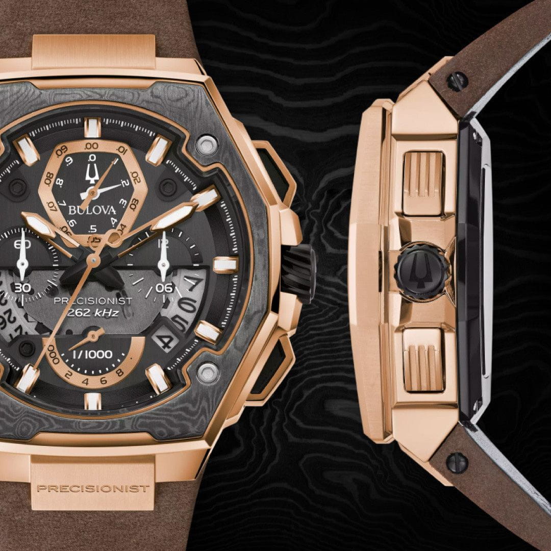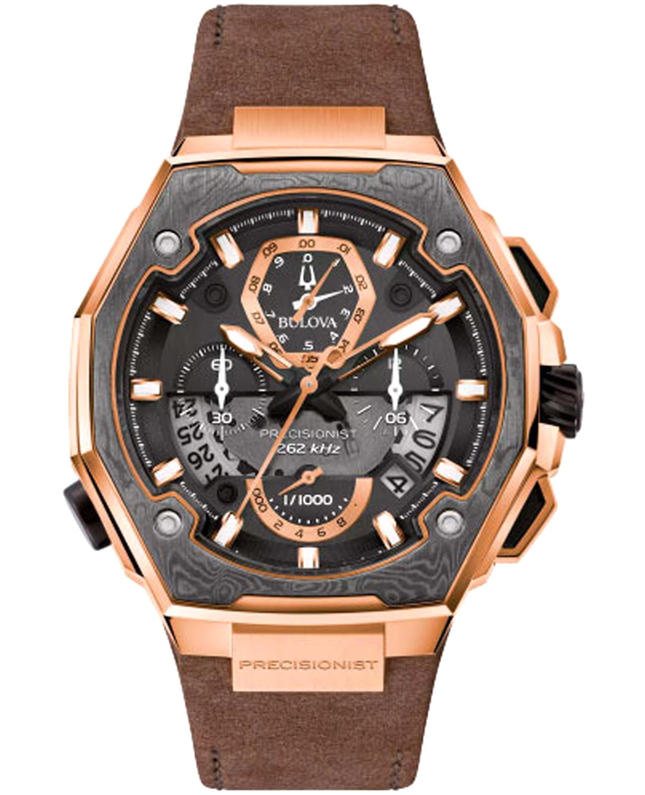 Мужские кварцевые часы-хронографХронографФункция позволяет измерять отрезки времени с особой точностью: часы, минуты, секунды. Верным признаком хронографа является наличие на циферблате 3 дополнительных окошек-счётчиков. с секундомеромСекундомерСекундоме́р — прибор, способный измерять интервалы времени с точностью до долей секунды. Bulova Precisionist X Special Edition 98B356 – отражающий идеальное сочетание современного дизайна, надёжности и функциональности. Сверхточный кварцевый хронограф. Частота колебаний механизма составляет 262 кГц , что превышает мировой стандарт в 8 раз. Корпус из нержавеющей стали с PVD-покрытиемPVDУльтратонкое покрытие наносится в технике вакуумного напыления, сочетает в себе нитрид титана особой прочности со слоем золота или оксида хрома. Несёт в себе декоративную или защитную функцию. цвета розового золота, диаметром 44.5 мм идеально сбалансирован и надежен. Сапфировое стеклоСапфировое стеклоПрочный и надёжный материал из кристалла сапфира синтетического происхождения, характеризующийся особой твёрдостью и устойчивостью к царапинам и повреждениям. защищает циферблат от царапин и устойчивое к механическим повреждениям. На черном циферблате есть окошко календаря. Кожаный ремешок на застёжке-бабочке с кнопкамиЗастёжка "бабочка"Такой вид застёжки дополняется предохранителями, помогающими избежать случайного раскрытия браслета. Обладают изящным исполнением. обеспечивает комфортное ношение. БезельБезельВнешний ободок, закрепляющий стекло. В спортивных часах так называется поворотное кольцо с делениями на циферблате, выполняет роль таймера – замеряет отрезки времени на шкале. Неподвижный безель – элемент декора. Однонаправленно вращающийся безель на дайверских часах позволяет фиксировать моменты погружения и выныривания на поверхность. с вставкой из серой дамасской стали. Водозащита 50 метров позволит защитить корпус от случайных брызг или капель дождя. Стрелки и метки с люминесцентным покрытиемЛюминесцентное покрытиеПозволяет считывать показания времени в темноте. Производители наносят на стрелки, часовые индексы, безель или поверхность циферблата светонакопительный состав, дающий холодное свечение. позволяющие легко определять время даже в темноте. Эта модель – отличный выбор для тех, кто ищет сочетание стиля, качества и функциональности. Часы станут не только полезным аксессуаром, но и выразительным элементом вашего имиджа.