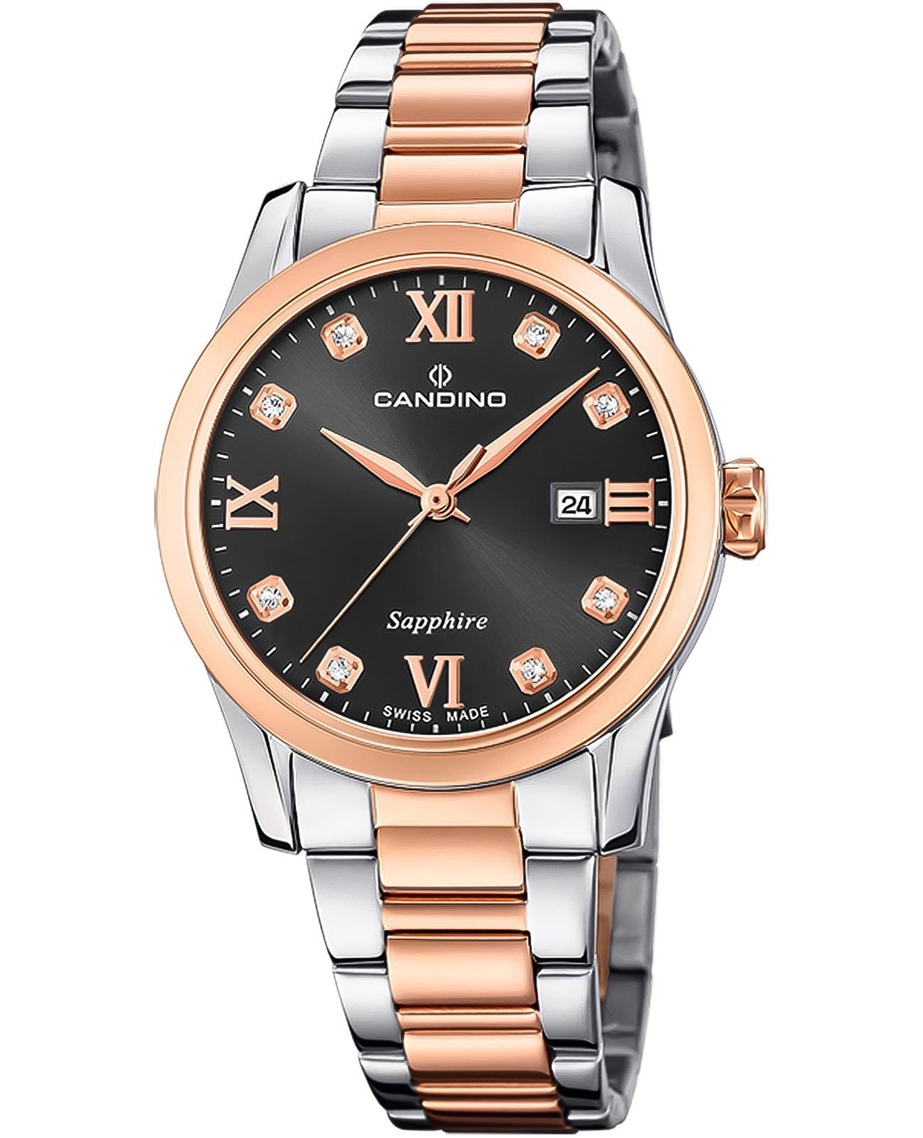 Женские швейцарские часы Candino Elegance C4739/5 с надёжным кварцевым механизмом. Корпус часов изготовлен из нержавеющей стали. Сапфировое стеклоСапфировое стеклоПрочный и надёжный материал из кристалла сапфира синтетического происхождения, характеризующийся особой твёрдостью и устойчивостью к царапинам и повреждениям. устойчивое к мелким механическим повреждениям. Стальной браслет с частичным PVD-покрытиемPVDУльтратонкое покрытие наносится в технике вакуумного напыления, сочетает в себе нитрид титана особой прочности со слоем золота или оксида хрома. Несёт в себе декоративную или защитную функцию. на раскладной застёжкеРаскладная застёжкаТакой тип застёжки используется только на браслетах из металла. Она никогда не раскрывается полностью, происходит разделение на 2 и более частей. Раскладывающая застёжка снизит вероятность потери часов к минимуму.. Циферблат украшен цирконами. Окошко даты находится в положении 3 часа. Класс водозащиты: 50 метров, позволит защитить корпус от случайных брызг или капель дождя.