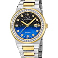 Женские наручные часы Candino Lady Elegance Sparkling Date C4750/3 с надёжным кварцевым механизмом. Корпус и браслет часов изготовлены из нержавеющей стали. Сапфировое стеклоСапфировое стеклоПрочный и надёжный материал из кристалла сапфира синтетического происхождения, характеризующийся особой твёрдостью и устойчивостью к царапинам и повреждениям. повышенной прозрачности, устойчивое к мелким механическим повреждениям. Стальной браслет с частичным PVD-покрытиемPVDУльтратонкое покрытие наносится в технике вакуумного напыления, сочетает в себе нитрид титана особой прочности со слоем золота или оксида хрома. Несёт в себе декоративную или защитную функцию. на раскладной застёжкеРаскладная застёжкаТакой тип застёжки используется только на браслетах из металла. Она никогда не раскрывается полностью, происходит разделение на 2 и более частей. Раскладывающая застёжка снизит вероятность потери часов к минимуму.. Стрелки и метки с люминесцентным покрытиемЛюминесцентное покрытиеПозволяет считывать показания времени в темноте. Производители наносят на стрелки, часовые индексы, безель или поверхность циферблата светонакопительный состав, дающий холодное свечение.. Двухцветный циферблат с россыпью звёзд и безельБезельВнешний ободок, закрепляющий стекло. В спортивных часах так называется поворотное кольцо с делениями на циферблате, выполняет роль таймера – замеряет отрезки времени на шкале. Неподвижный безель – элемент декора. Однонаправленно вращающийся безель на дайверских часах позволяет фиксировать моменты погружения и выныривания на поверхность. инкрустированы цирконами. Класс водозащиты: 50 метров, позволит защитить корпус от случайных брызг или капель дождя. Окошко даты находится в положении 3 часа.