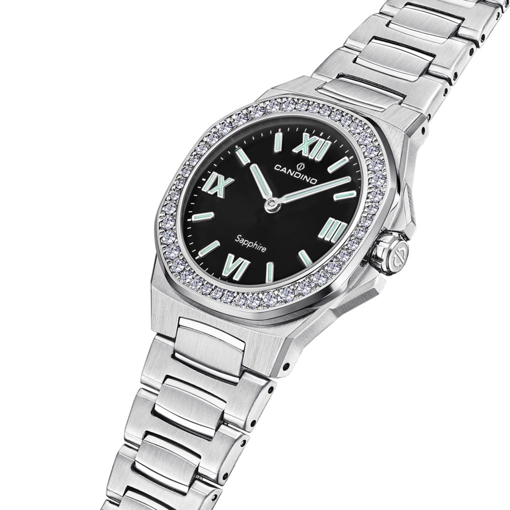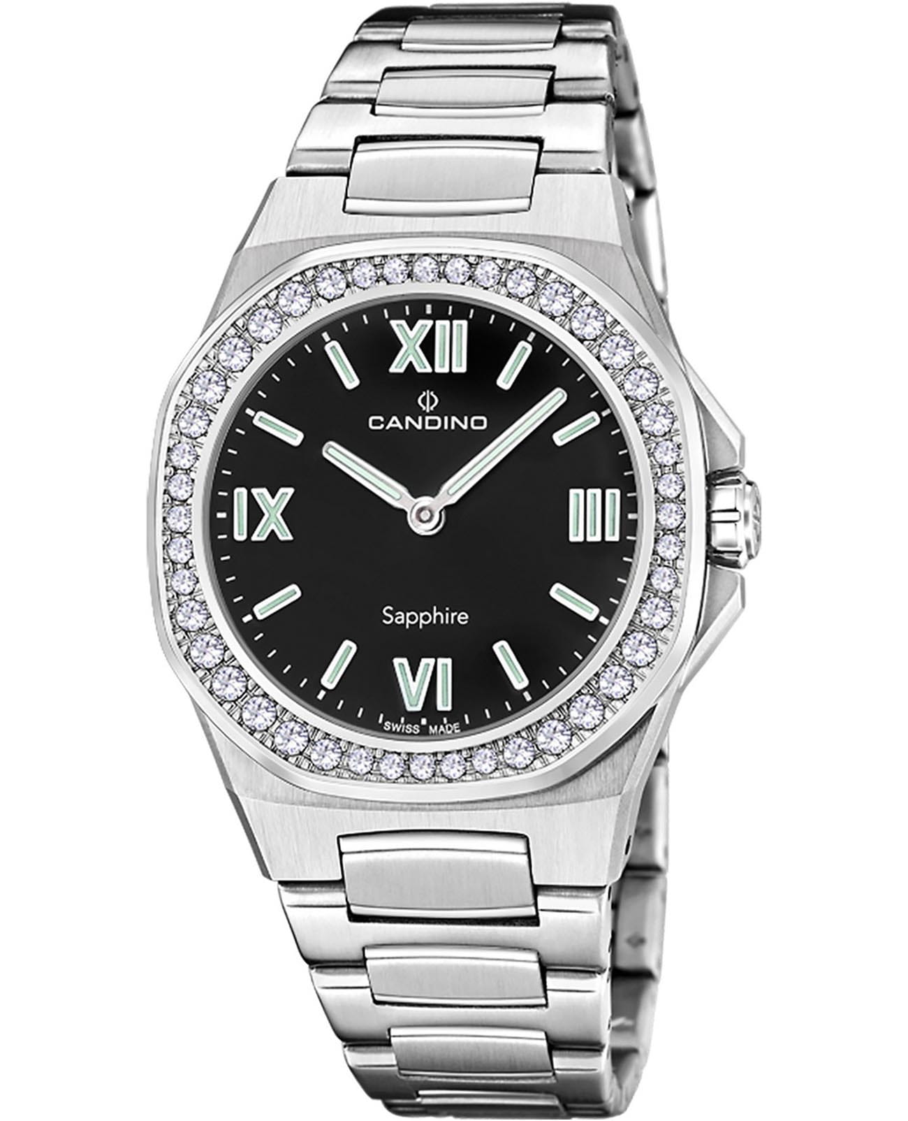 Женские наручные часы Candino Elegance C4753/5 с надёжным кварцевым механизмом. Корпус и браслет часов изготовлены из нержавеющей стали. Сапфировое стеклоСапфировое стеклоПрочный и надёжный материал из кристалла сапфира синтетического происхождения, характеризующийся особой твёрдостью и устойчивостью к царапинам и повреждениям. повышенной прозрачности, устойчивое к мелким механическим повреждениям. Стальной браслет на раскладной застёжкеРаскладная застёжкаТакой тип застёжки используется только на браслетах из металла. Она никогда не раскрывается полностью, происходит разделение на 2 и более частей. Раскладывающая застёжка снизит вероятность потери часов к минимуму.. Стрелки и метки с люминесцентным покрытиемЛюминесцентное покрытиеПозволяет считывать показания времени в темноте. Производители наносят на стрелки, часовые индексы, безель или поверхность циферблата светонакопительный состав, дающий холодное свечение.. БезельБезельВнешний ободок, закрепляющий стекло. В спортивных часах так называется поворотное кольцо с делениями на циферблате, выполняет роль таймера – замеряет отрезки времени на шкале. Неподвижный безель – элемент декора. Однонаправленно вращающийся безель на дайверских часах позволяет фиксировать моменты погружения и выныривания на поверхность. инкрустирован кристаллами. Класс водозащиты: 50 метров, позволит защитить корпус от случайных брызг или капель дождя.