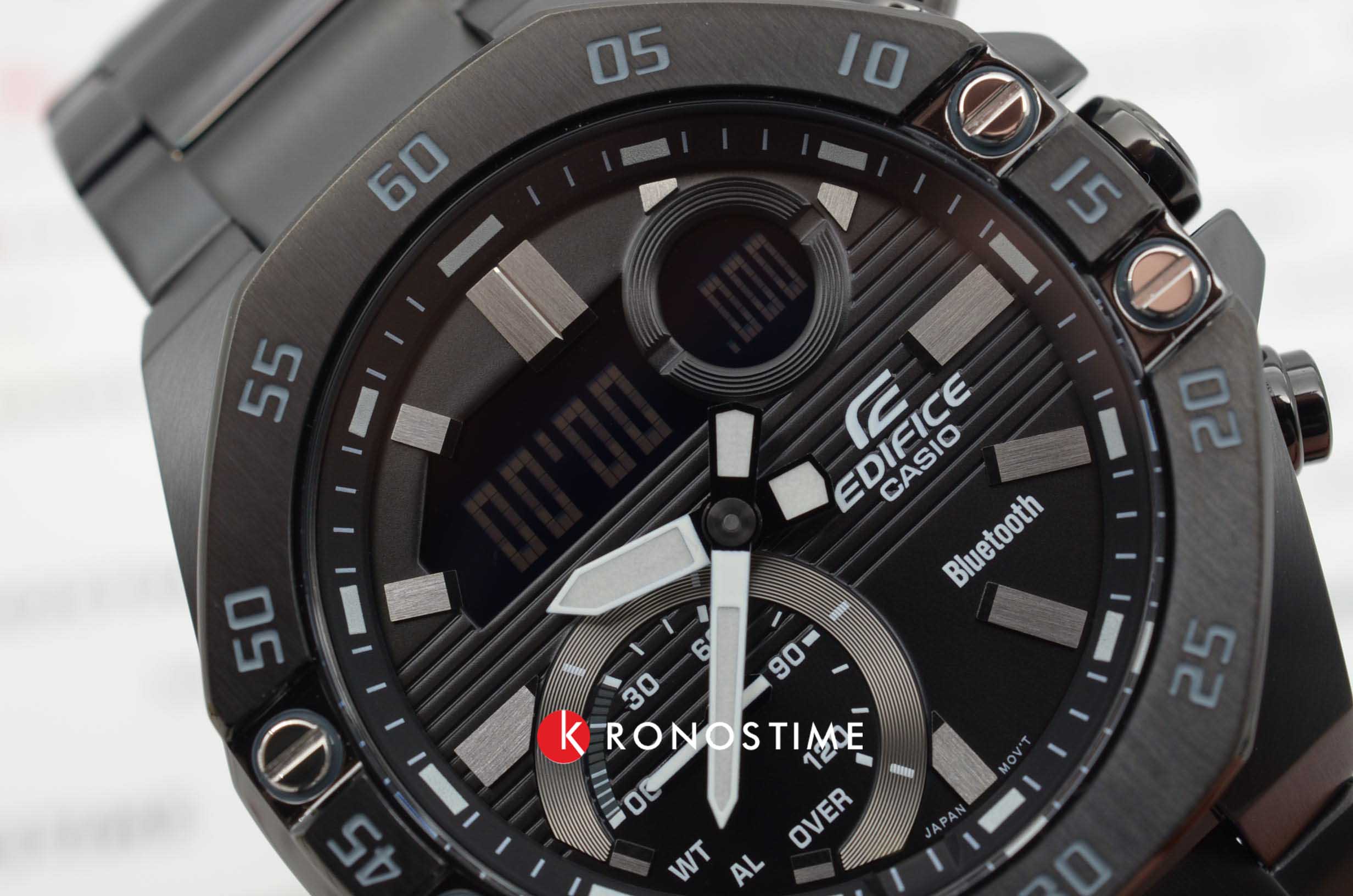 Аналого-цифровой хронографХронографФункция позволяет измерять отрезки времени с особой точностью: часы, минуты, секунды. Верным признаком хронографа является наличие на циферблате 3 дополнительных окошек-счётчиков. отличается синим циферблатом с гоночным характером и горизонтальным узором. Необычным элементом стал 8-угольный безельБезельВнешний ободок, закрепляющий стекло. В спортивных часах так называется поворотное кольцо с делениями на циферблате, выполняет роль таймера – замеряет отрезки времени на шкале. Неподвижный безель – элемент декора. Однонаправленно вращающийся безель на дайверских часах позволяет фиксировать моменты погружения и выныривания на поверхность. с 4-мя винтами. Он напоминает о профессиональных инструментах, используемых при обслуживании гоночных болидов. Часы оснащены запланированным таймером для грамотного распределения времени. Он получает информацию с календаря посредством технологии BluetoothBluetoothСовременная технология, позволяющая синхронизировать часы с телефоном и переносить данные. Часы с Bluetooth расширяют возможности вашего смартфона и делают его использование ещё более удобным.. Японский кварцевый механизм. Срок службы батарейки CR2016 - 2 года. Двойная светодиодная подсветкаСветодиодная подсветкаСветодиодная или LED-подсветка обеспечивает появление яркого холодного свечения за счёт LED-элементов - маленьких лампочек. Они потребляют минимальное количество энергии, чаще всего можно встретить 1 светодиод, в нижней части циферблата.. Корпус и браслет из антикоррозионной стали 316L с IP-покрытиемIP-покрытиеМетод ионного напыления. Демонстрирует повышенную устойчивость к истиранию, окислению и химическим веществам. Под воздействием высокого давления и температуры около 1500°C молекулы металла надёжно соединяются с частицами корпуса часов.. Минеральное стекло. Автоматическая коррекция стрелок. Водонепроницаемость 100 метров. Будильник, мировое времяМировое время Полезное часовое усложнение, отображающее время в основных городах и известных областях по всему миру, оно связано с часовыми поясами, удобно для путешественников и бизнесменов. , секундомер, автоматический календарь. Габариты: 51 x 48,5 x 12,5 мм.