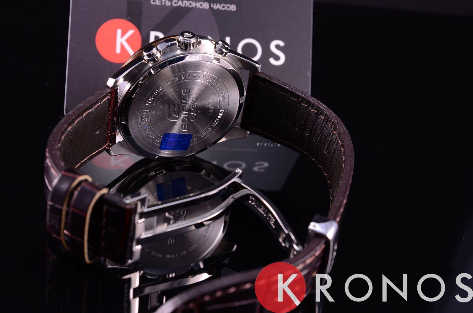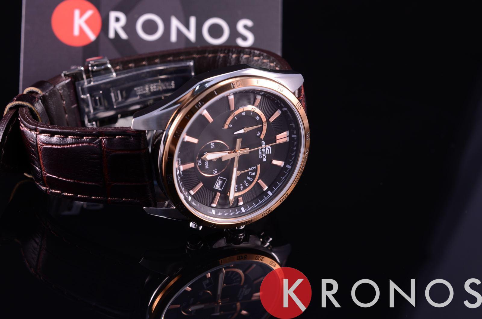 Мужские классические наручные часы Casio Edifice надежные и практичные. Кварцевый японский механизм Miyota. Точность хода не хуже -10 +15 сек./в месяц. Часы оснащены функцией хронографа. Циферблат черного цвета с контрастными, позолоченными индексами. Стрелки и индексы с светонакопительным нанесением. Корпус выполнен из нержавеющей стали с частичным IP покрытием. Ремешок из натуральной кожи, коричневого цвета, с удобной застежкой. Минеральное стекло устойчиво к появлению царапин. Водонепроницаемость 100М. В часах можно плавать.
