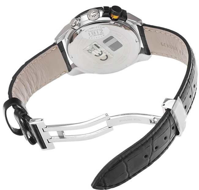 Кварцевый японский механизм Miyota. Точность хода не хуже -10 +15 сек./в месяц.Часы оснащены функцией хронографа. Циферблат белого цвета с контрастными элементами дизайна. Стрелки и индексы с светонакопительным нанесением. Корпус выполнен из нержавеющей стали с частичным. Ремешок из натуральной кожи, черного цвета, с удобной застежкой. Минеральное стекло устойчиво к появлению царапин. Водонепроницаемость 100М. В часах можно плавать. Степень водонепроницаемости не является величиной, эквивалентной функциональной рабочей глубине.