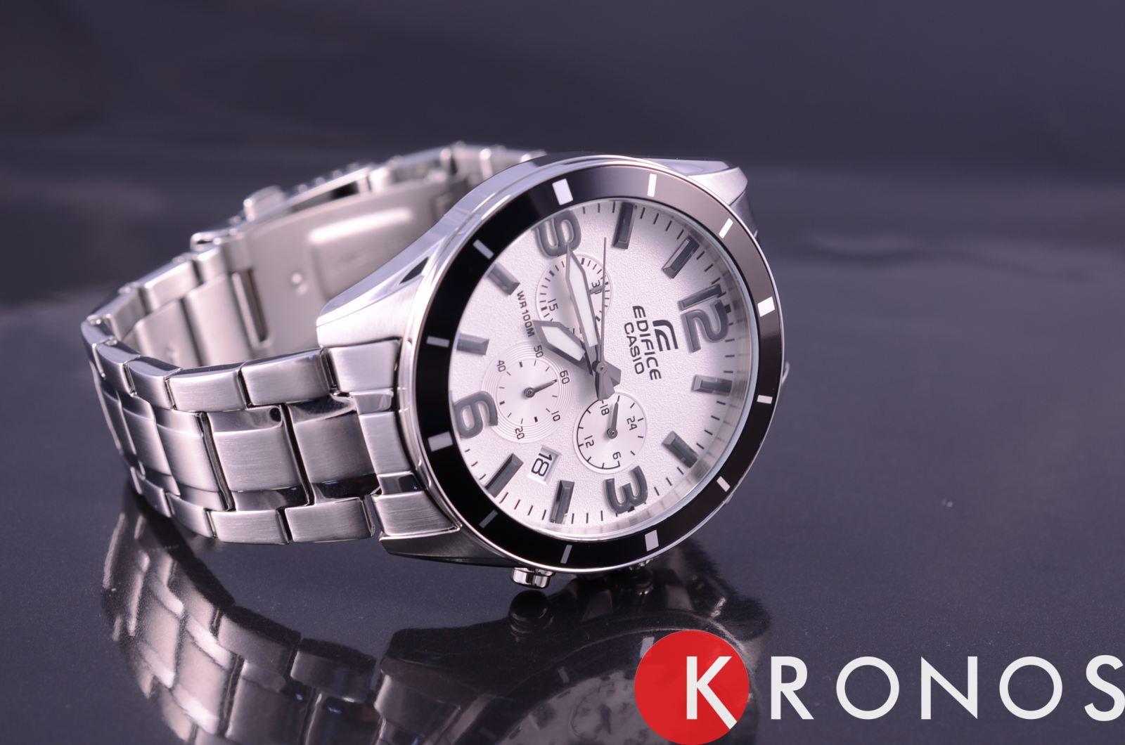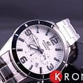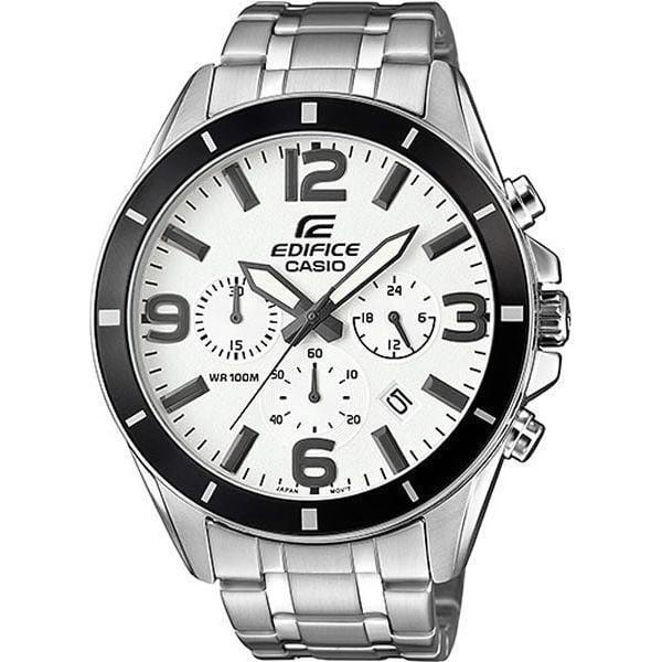 Стильный, мужские наручные часы Casio Edifice надежные и практичные. Кварцевый японский механизм Miyota. Точность хода не хуже -10 +15 сек./в месяц. Часы оснащены функцией хронографа, с точностью 1/10с и временем измерения 1ч. Циферблат белого цвета с контрастными элементами дизайна. Стрелки и индексы с светонакопительным нанесением. Корпус и браслет выполнены из нержавеющей стали. Безель с IP покрытием черного цвета. Минеральное стекло устойчиво к появлению царапин. Водонепроницаемость 100М. В часах можно плавать. Степень водонепроницаемости не является величиной, эквивалентной функциональной рабочей глубине.