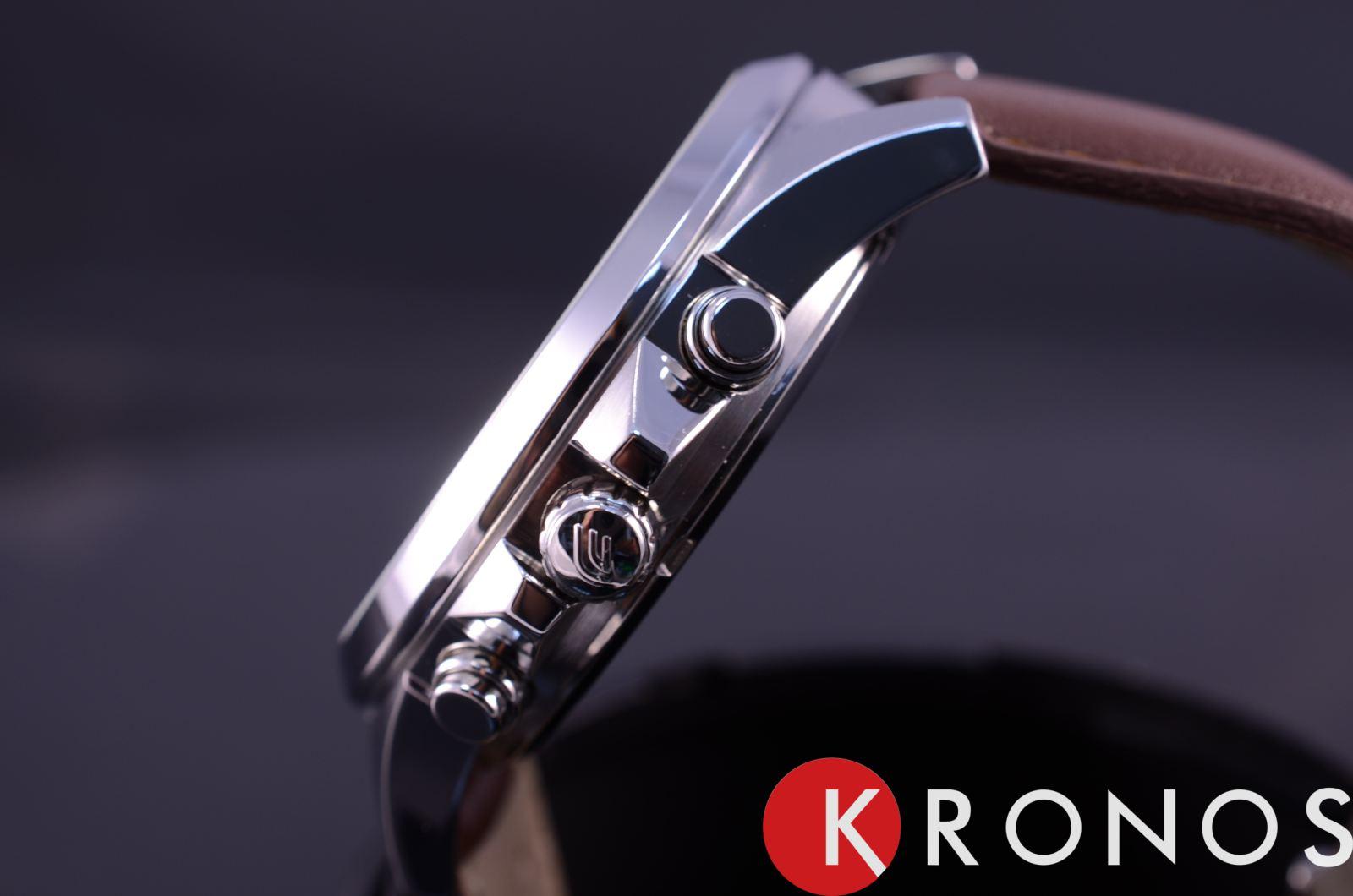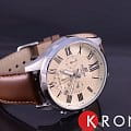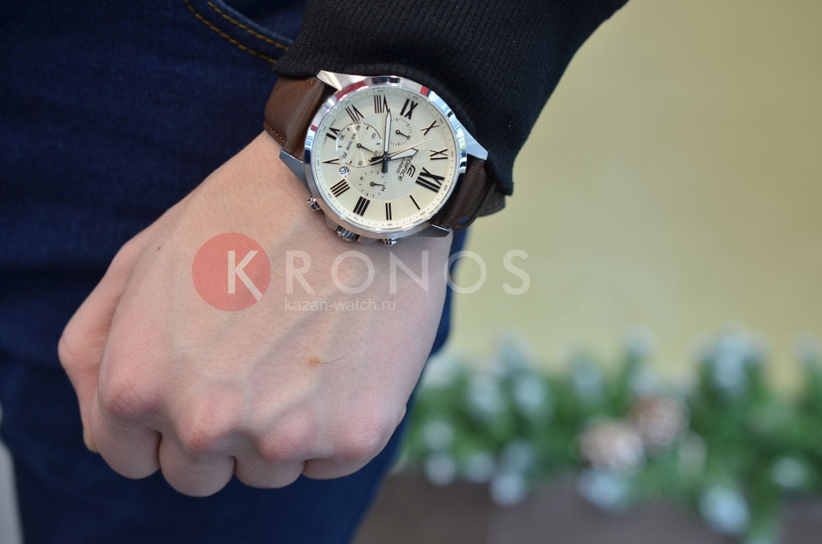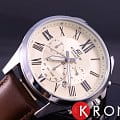 Кварцевый японский механизм Miyota. Точность хода не хуже -10 +15 сек./в месяц. Часы оснащены функцией хронографа, с точностью 1/10с и временем измерения 1ч. Циферблат бежевого цвета с контрастными элементами дизайна. Стрелки и индексы с светонакопительным нанесением. Корпус выполнен из нержавеющей стали. Ремешок из натуральной кожи коричневого цвета. Минеральное стекло устойчиво к появлению царапин. Водонепроницаемость 100М. В часах можно плавать. Степень водонепроницаемости не является величиной, эквивалентной функциональной рабочей глубине.