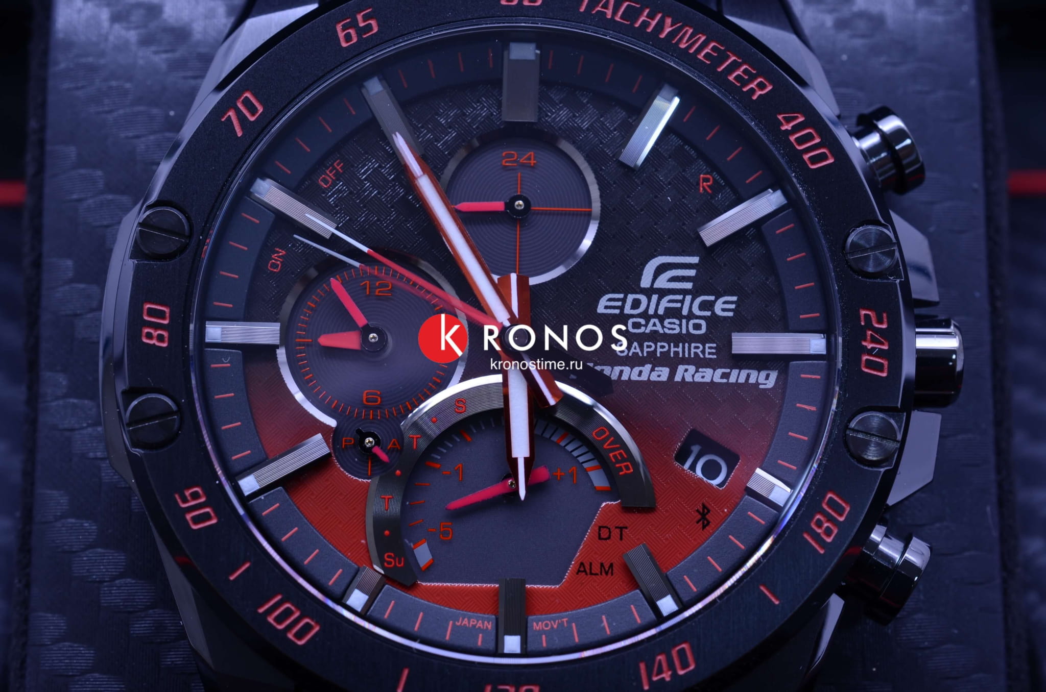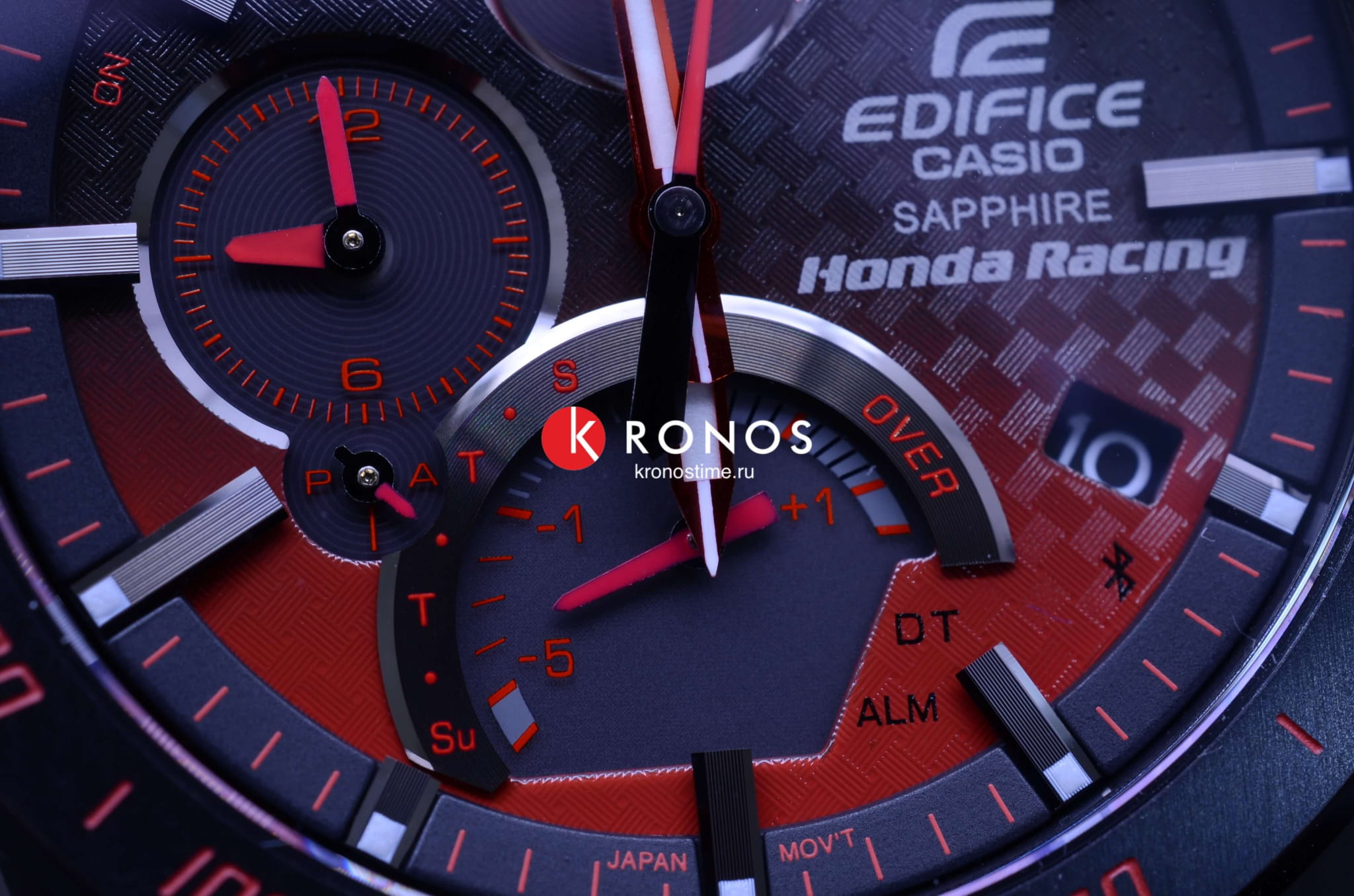 Чёрно-красный градиент навевает мысли о моменте зажигания искрой топлива в цилиндре двигателя, шахматный узор напоминает стартовый флаг. Корпус и браслет имеют ионное IP-покрытие, повышающее долговечность материала. Технология BluetoothBluetoothСовременная технология, позволяющая синхронизировать часы с телефоном и переносить данные. Часы с Bluetooth расширяют возможности вашего смартфона и делают его использование ещё более удобным. позволяет синхронизировать данные со смартфоном. Ультратонкий корпус 8,9 мм. Индикатор заряда батареи. Люминесцентная подсветкаЛюминесцентное покрытиеПозволяет считывать показания времени в темноте. Производители наносят на стрелки, часовые индексы, безель или поверхность циферблата светонакопительный состав, дающий холодное свечение.. Водонепроницаемость при давлении 10 бар. Стекло с антибликовым покрытием. ХронографХронографФункция позволяет измерять отрезки времени с особой точностью: часы, минуты, секунды. Верным признаком хронографа является наличие на циферблате 3 дополнительных окошек-счётчиков., секундомер, индикация числа, будильник, мировое времяМировое время Полезное часовое усложнение, отображающее время в основных городах и известных областях по всему миру, оно связано с часовыми поясами, удобно для путешественников и бизнесменов. . Габариты: 49,9 x 45,6 x 8,9 мм.
