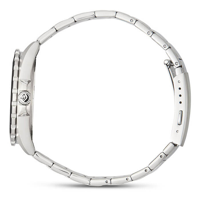 Серебристо-чёрная модель наделена элементами дайверского дизайна, повторяя внешний облик механических часов для дайвинга 1950-х годов, в глаза бросается массивный однонаправленно вращающийся безельБезельВнешний ободок, закрепляющий стекло. В спортивных часах так называется поворотное кольцо с делениями на циферблате, выполняет роль таймера – замеряет отрезки времени на шкале. Неподвижный безель – элемент декора. Однонаправленно вращающийся безель на дайверских часах позволяет фиксировать моменты погружения и выныривания на поверхность. с фигурным краем, крупные стрелки и часовые индексы. Секундная стрелка дополнена жёлтым наконечником, что обеспечивает превосходную читаемость показаний с циферблата. Кварцевый японский механизм с точностью хода часов +/- 20 секунд в месяц. Батарейка рассчитана на 3 года работы. Люминесцентная подсветка NeobriteПодсветка NeobriteИспользование светонакопительных составов на основе сульфида цинка или алюмината стронция, яркий свет можно наблюдать на протяжении 6-10 часов после «зарядки» часов около источника света.. Водонепроницаемость при давлении до 10 бар. Ударопрочный корпусУдаропрочный корпусМеханизм заключён в корпус, выполненный из современных материалов, устойчивых к ударам, механическим повреждениям и падению с высоты: инновационный пластик, карбон, нержавеющая сталь, титан. и браслет из нержавеющей стали 316L. Чёрное IP-покрытиеIP-покрытиеМетод ионного напыления. Демонстрирует повышенную устойчивость к истиранию, окислению и химическим веществам. Под воздействием высокого давления и температуры около 1500°C молекулы металла надёжно соединяются с частицами корпуса часов.. Минеральное стекло. Окошко индикации числа. Габариты: 42 x 37,8 x 9,4 мм.