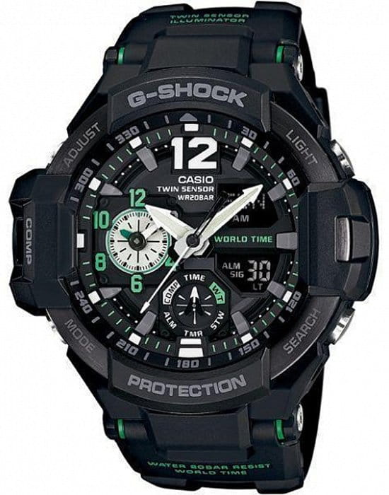 Ударопрочная конструкция защищает от ударов и вибрации. Светящееся покрытие обеспечивает длительную подсветку в темное время суток после короткого воздействия света. Встроенный цифровой компас определяет северный магнитный полюс. Датчик измеряет температуру окружающего воздуха вокруг часов и отображает ее на экране в градусах °C (-10°C /+60°C). Отображение текущего времени в основных городах и конкретных областях по всему миру. Функция секундомера - 1/100 сек. - 1 час. Для поклонников точности: таймеры обратного отсчета напомнят Вам о текущих или особенных событиях, издав звуковой сигнал в установленное время. Время можно предварительно настроить от 1 минуты и до 1 часа. Нажатие на кнопку обеспечит перемещение стрелок в такое положение, которое позволит Вам легко считать информацию с маленьких цифровых дисплеев – например, дату или показатели секундомера. Можно отключить звук при нажатии кнопок. Автоматический календарь. Прочное, устойчивое к царапинам минеральное стекло защищает часы от повреждений. Корпус из нержавеющей стали и полимерного пластика. Ремешок из полимерного материала. Водонепроницаемость (20 Бар). Идеально подходит для ныряния без акваланга.
