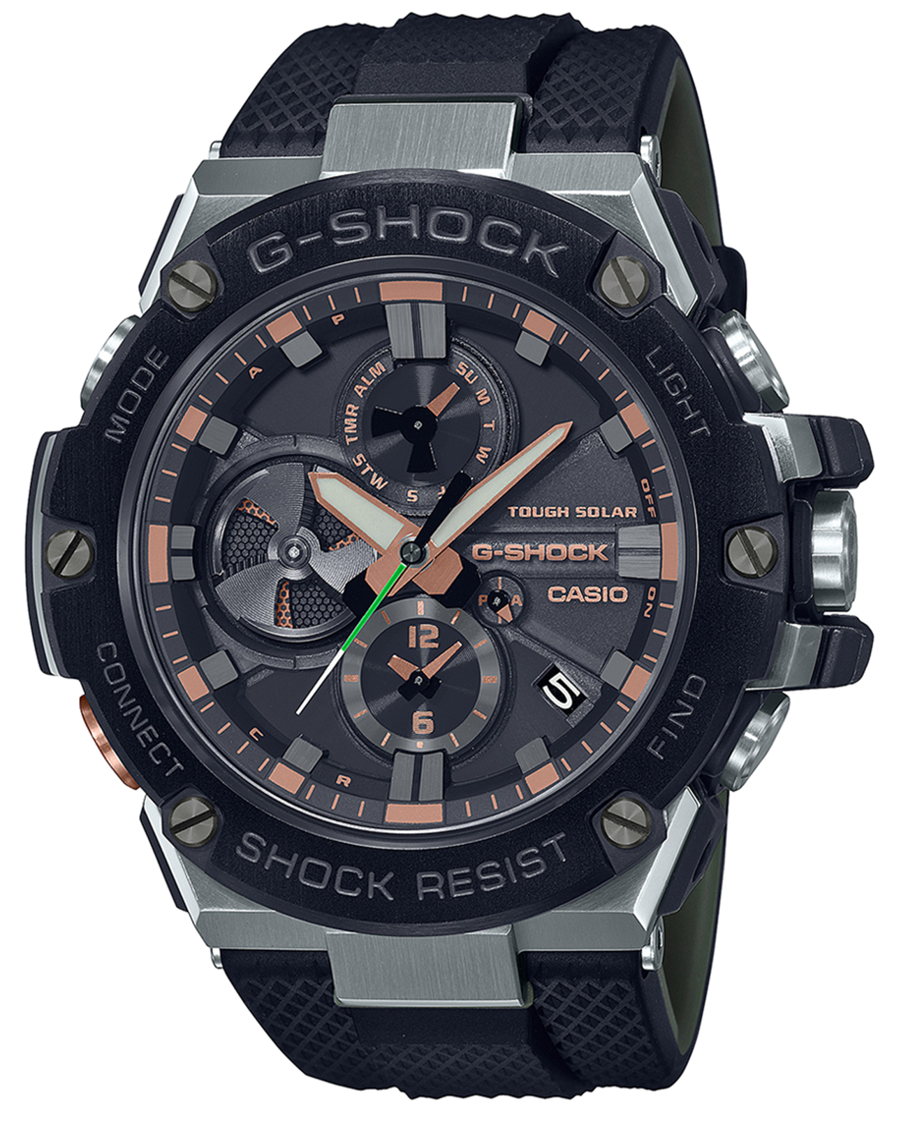 Наручные часы выпущены в брутальном, слегка агрессивном дизайне. Они оформлены в чёрном цвете, ярким элементом стал оранжевый счётчик на метке 9 часов, имитирующий турбину двигателя самолёта. Окошко предназначено для контроля уровня заряда батарейки, чем больше цвета видно, тем выше необходимость поставить часы на подзарядку. Модель серии G-Steel оснащена японским кварцевым механизмом, получаемым энергию для работы от источников света. Так реализуется технология . Аксессуар наделён противоударным корпусомУдаропрочный корпусМеханизм заключён в корпус, выполненный из современных материалов, устойчивых к ударам, механическим повреждениям и падению с высоты: инновационный пластик, карбон, нержавеющая сталь, титан. из полимера и стали 316L, что позволяет усилить конструкцию. На стрелки нанесено люминесцентное покрытиеЛюминесцентное покрытиеПозволяет считывать показания времени в темноте. Производители наносят на стрелки, часовые индексы, безель или поверхность циферблата светонакопительный состав, дающий холодное свечение., аналоговый циферблат подсвечивается светодиодомСветодиодная подсветкаСветодиодная или LED-подсветка обеспечивает появление яркого холодного свечения за счёт LED-элементов - маленьких лампочек. Они потребляют минимальное количество энергии, чаще всего можно встретить 1 светодиод, в нижней части циферблата.. Синхронизация со смартфоном BluetoothBluetoothСовременная технология, позволяющая синхронизировать часы с телефоном и переносить данные. Часы с Bluetooth расширяют возможности вашего смартфона и делают его использование ещё более удобным. позволяет устанавливать точное время, настраивать параметры будильника, мирового времениМировое время Полезное часовое усложнение, отображающее время в основных городах и известных областях по всему миру, оно связано с часовыми поясами, удобно для путешественников и бизнесменов. . Функции: ежедневный будильник, секундомер, хронографХронографФункция позволяет измерять отрезки времени с особой точностью: часы, минуты, секунды. Верным признаком хронографа является наличие на циферблате 3 дополнительных окошек-счётчиков., таймер, вечный календарьВечный календарьКлассическое часовое усложнение, представляющее собой календарь, рассчитанный на несколько лет вперёд (стандартно – до 2099 года). Определяет текущую дату, день недели, месяц.. Габариты: 58,1мм x 53,8мм x 14,1ммp>